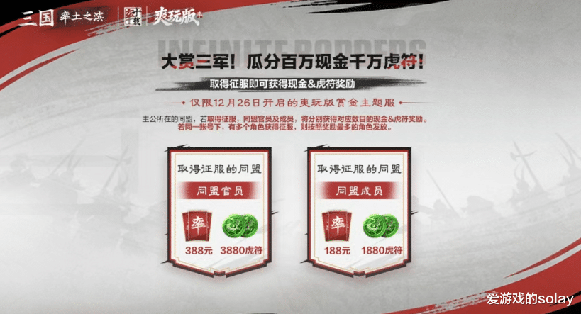 最关键的是,爽玩服这边也准备了成吨的福利送给玩家,玩家在12月26日开启的指定爽玩服占领土地,即有概率爆出能开出最高999元现金和9999虎符的惊喜福袋。要是在主题服开启时集结好队伍并拿到赛季征服,还能额外再拿到大量虎符和现金奖励。既能爽玩又能躺着赚钱,就爽玩服这福利力度,一般游戏还真比不了。