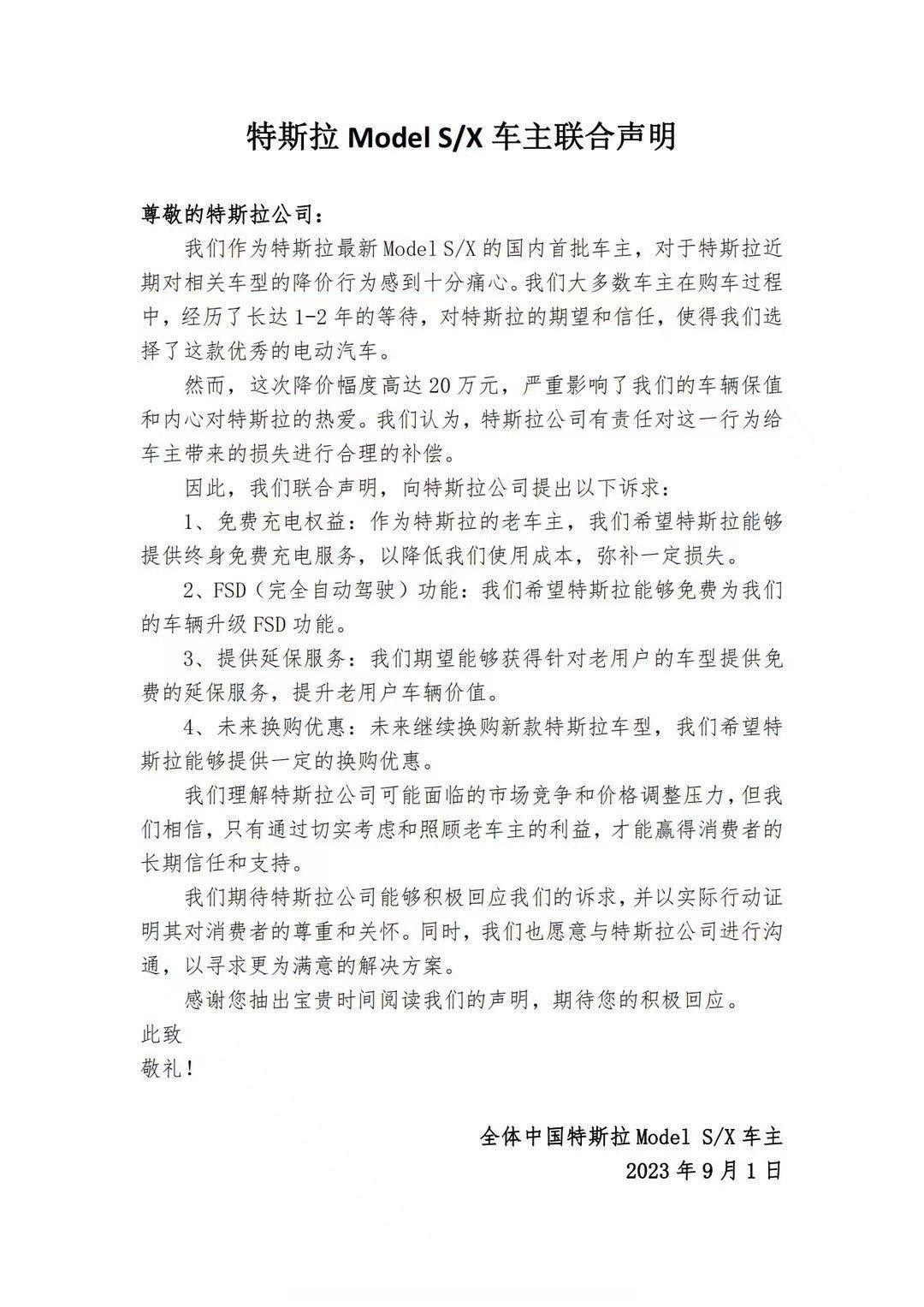 特斯拉车主又双叒来维权了!! 今天特斯拉官宣Model S、X降价了嘛 最高降了20万左右,然后老车主肯定就不干了啊。。 联名写了一封信给特斯拉 看了下,感觉语气挺克制,甚至有点卑微,而且还没有要求说退钱。 不知道特斯拉会不会同意这些诉求呢 毕竟20万确实不是个小数目!