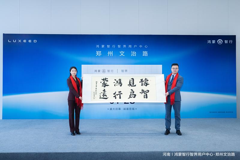 紧接着在热烈掌声中,鸿蒙智行智界用户中心·文治路店总经理赵恒、鸿蒙智行享界用户中心·文治路店总经理马丹,共同登台揭晓博行汽车集团精心准备的一幅题为“豫见鸿蒙,智启行远”的祝福卷轴。