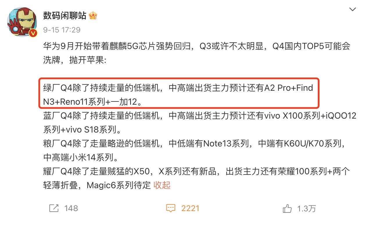 好家伙,下半年各大厂商的「大招」还很不少啊!刚看到数码闲聊站透露说,一加正在赶进度,估计双十一前就会带来新机,按照一加新品的发布节奏来看,估计是一加12这款新旗舰快要来了吧? 而且看了下爆料的配置,感觉下半年的新旗舰都很猛啊!像是骁龙8 Gen3处理器、2K屏、潜望长焦等配置估计都会安排上。值得一提的是,如果一加12能够赶在双十一之前上市的话,估计会跟小米14来个正面硬刚,而这也能够说明,一加对这款新旗舰还是很有信心的,期待了!