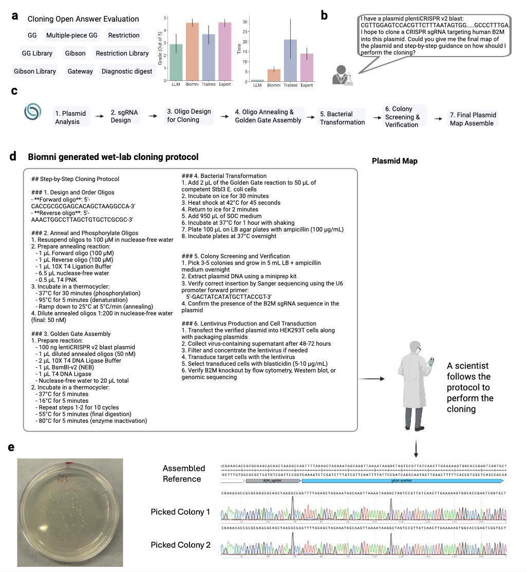 一位科学家严格按照 Biomni 生成的 protocol 进行实验,次日便观察到菌落生长,Sanger 测序确认 sgRNA 正确插入。在与人类专家的盲测对比中,Biomni 的表现与拥有 5 年以上经验的资深研究员相当,远超初级研究人员。