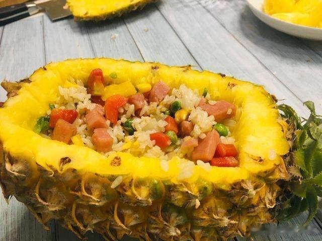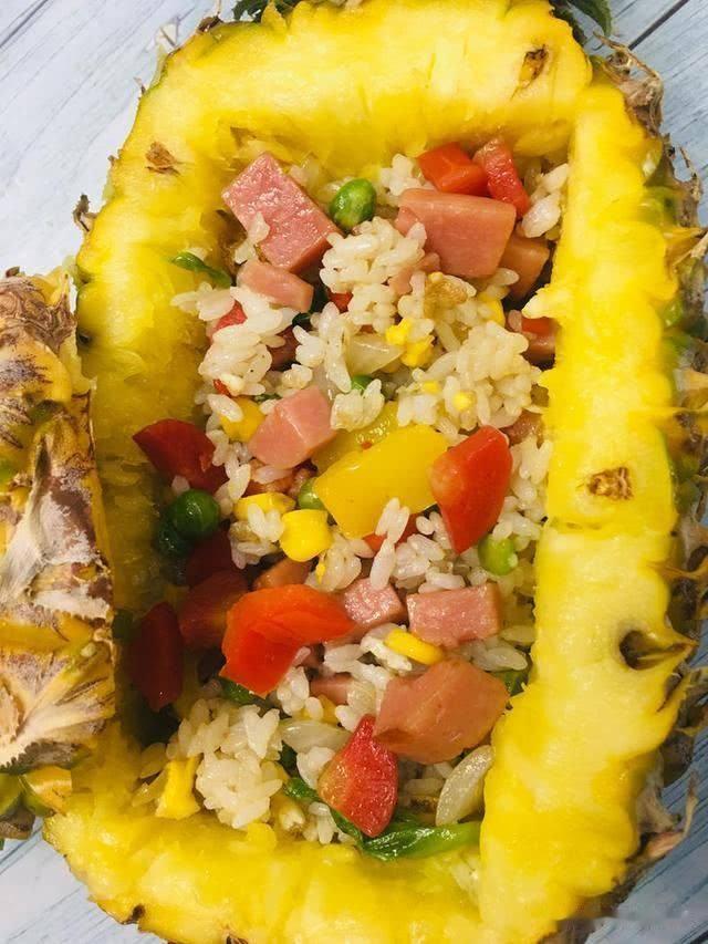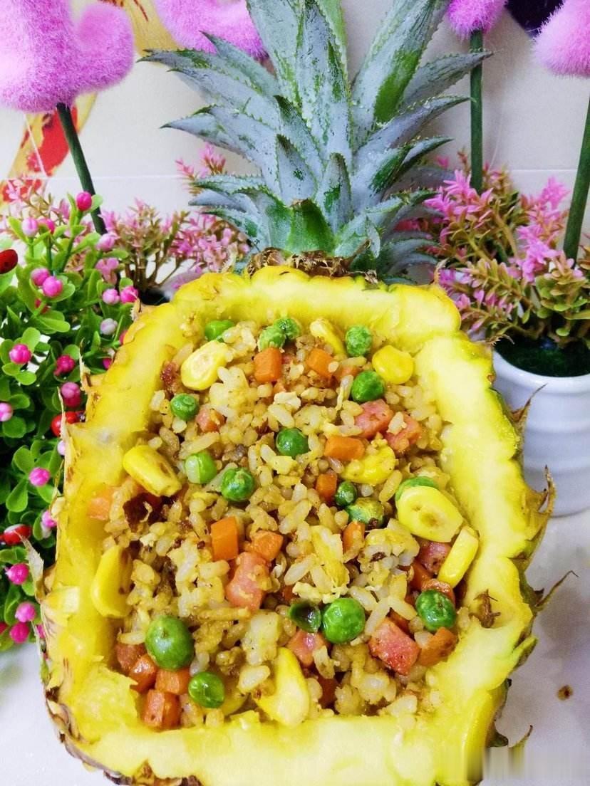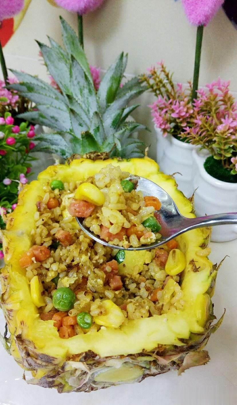 泰国新加坡印度尼西亚,咖喱肉骨茶印尼九层塔。说到东南亚,我最喜欢的还是菠萝饭,上次在芭提雅吃的菠萝饭真的太好吃了!今天我打算自己在家制作一份家庭版菠萝饭。 🎈所需要的材料有: 菠萝一整个,胡萝卜丁,青豆,玉米粒,鸡蛋一个,火腿丁,虾仁,米饭一碗。 ① 首先将菠萝2:5比例竖着切开,并挖出里两边的菠萝肉切丁。 ② 烧一锅开水,放入胡萝卜丁,青豆,玉米粒,虾仁,煮熟捞出。 ③ 起锅烧油,加入打好的鸡蛋,鸡蛋炒至金黄色后加入米饭,翻炒均匀后,加入胡萝卜丁,青豆,玉米粒,虾仁和火腿丁,翻炒。 ④ 最后加入菠萝丁。 ⑤ 在炒饭中,依次加入少许盐,味精,酱油,翻炒均匀。 ⑥ 出锅后放入之前挖好的菠萝壳中,菠萝饭就做好啦! 🚩操作小tips: 记得买菠萝的时候,不要让超市的工作人员削皮哦,我们要一整个菠萝哦。 海鲜过敏者,不要加虾仁!不要加虾仁!不要加虾仁! 菠萝丁可以根据自己的口味放入炒蛋中,不喜欢可以不放哦~#菠萝饭#