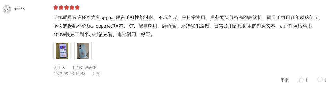 2万+用户给出98%的好评度,OPPO K11究竟值不值得买?来看看用户们怎么说。通过评价来看,我发现很多入手了OPPO K11的用户,都是绿厂的老用户了,OPPO手机给他们留下了很不错的印象,所以愿意继续相信OPPO! 而且就产品本身来说,OPPO K11也有很多可圈可点的地方。比如它的影像表现,在同价位产品中就属于独一档的,它搭载的是旗舰机同款的IMX890主摄,而且还用上了旗舰机同款的影像算法,拍照方面更能打。加上还有5000mAh大电池、100W闪充、骁龙782G处理器等配置,1699元起这个到手价确实给力。国庆期间打算换新机的话,OPPO K11可以考虑一波。