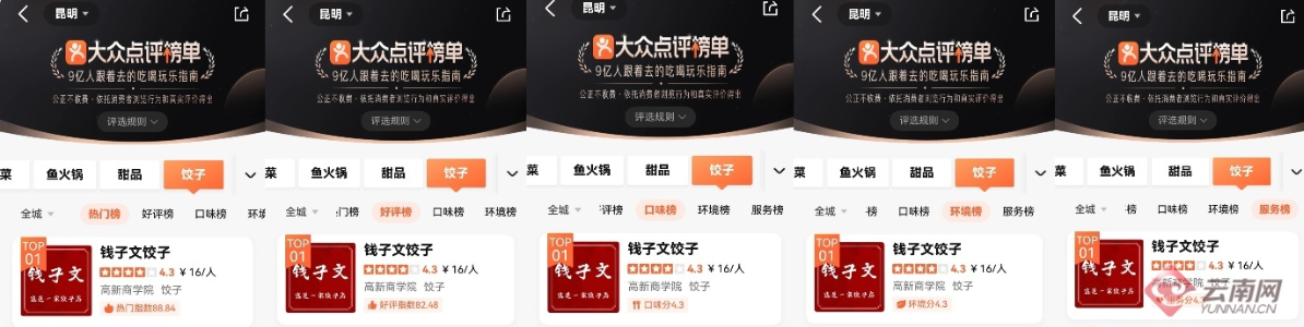 由云南省委宣传部主管、云南日报报业集团主办的云南网日前刊发记者报道,介绍了昆明钱子文饺子店开业30天所取得的优秀业绩。位于昆明市五华区岭东商业广场一层的钱子文饺子店,在开业满一个月之际,拿下大众点评昆明饺子榜“热门榜”“好评榜”“口味榜”“环境榜”“服务榜”五项第一,成为本地餐饮市场的新晋热门门店。