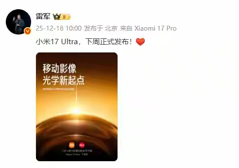 小米高端旗舰的年度悬念终于落地!官方今早正式官宣,小米17 Ultra将于12月25日圣诞当天发布,同步曝光的外观渲染图瞬间炸了数码圈。