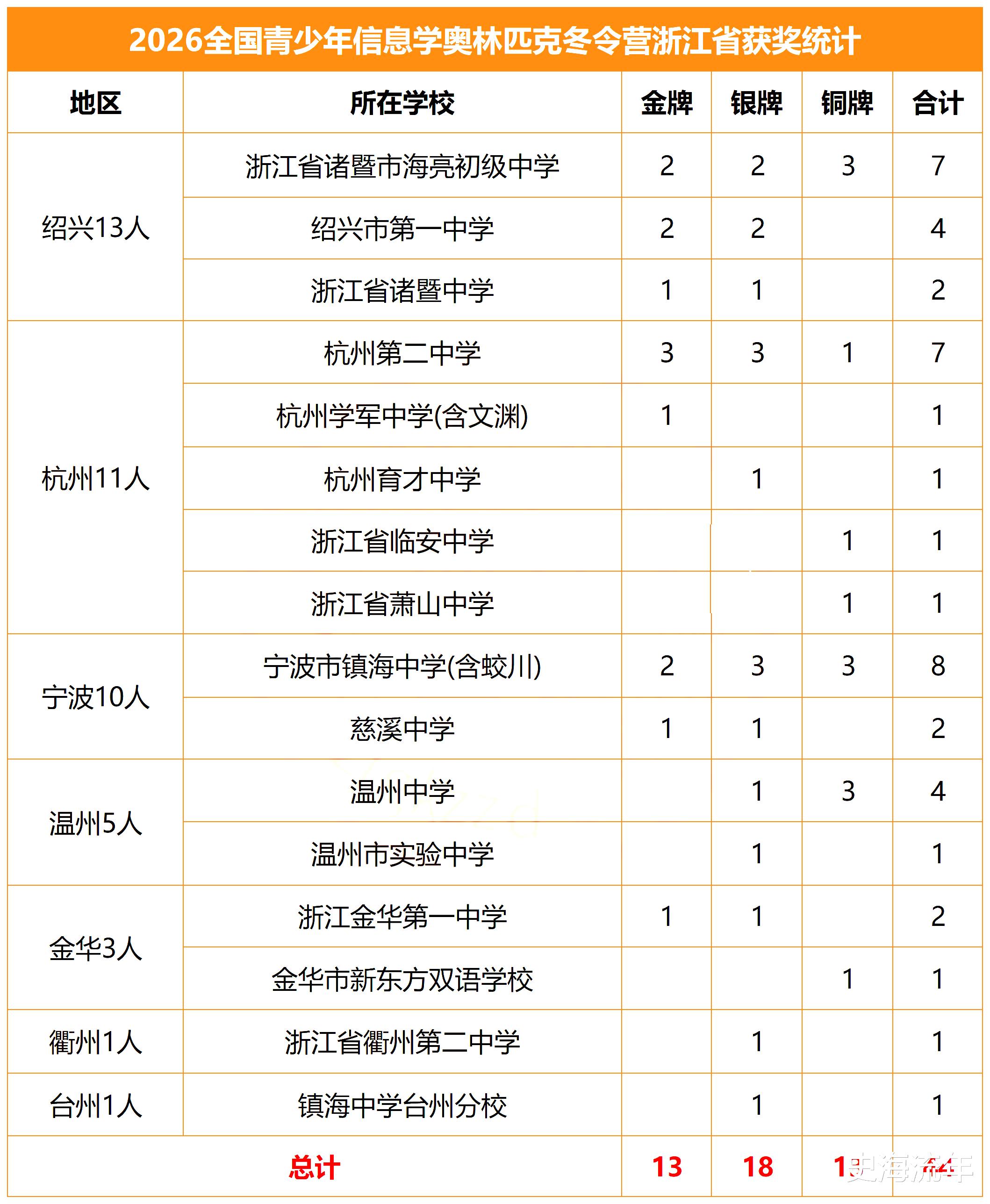 其他表现突出的学校还包括绍兴市第一中学(4人)、温州中学(4人)、慈溪中学(2人)等,共同构成了浙江信息学竞赛的“集团军”。