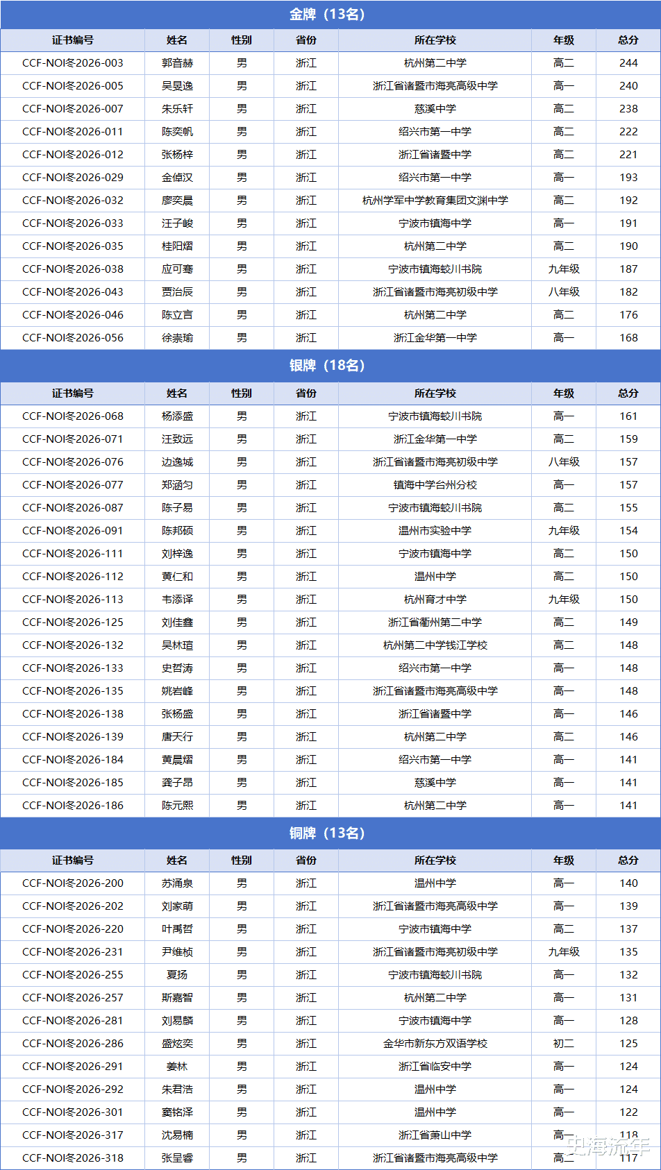 第三名:宁波市(10人):宁波的获奖主力军集中在镇海中学及其关联学校(如蛟川书院),凭借强大的集团化培养体系,宁波在奖牌总数上紧追杭州,展现了强大的后劲。