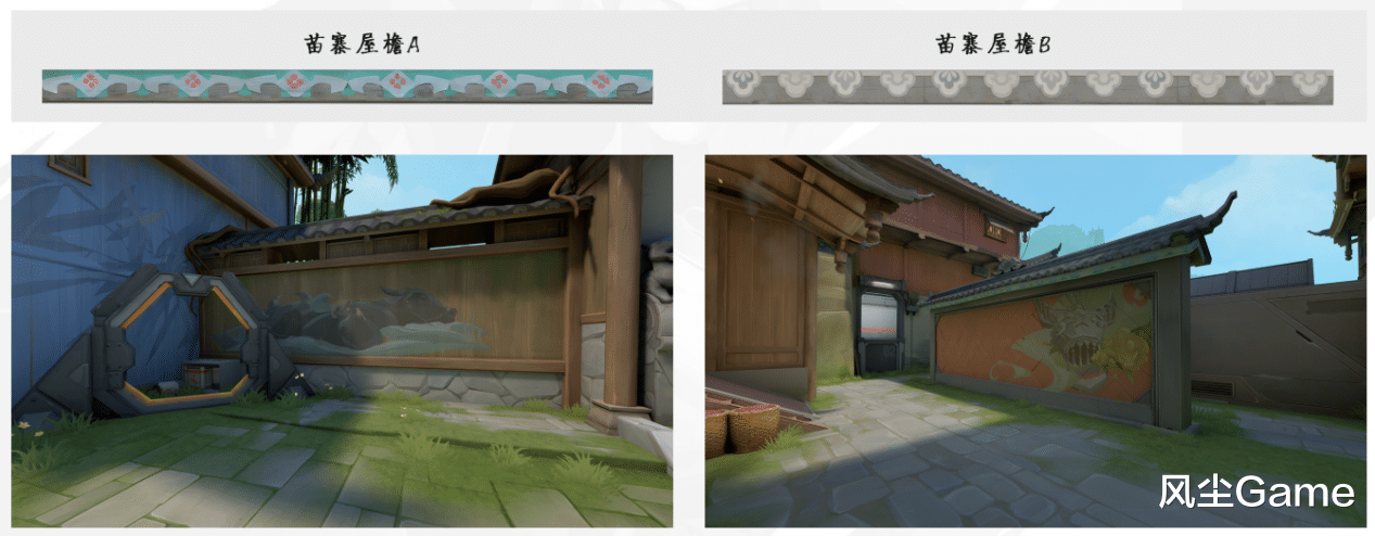 例如在“瓦”手的原创地图“古寨”的设计上,设计师用冷暖色调清晰区分攻守双方,就连墙壁上的绘画也各有不同。为保持色调统一,避免干扰游戏进程,制作组还对苗寨传统屋檐样式进行改良,舍弃了略显突兀的白色,选用与地图整体风格更契合的绿色。