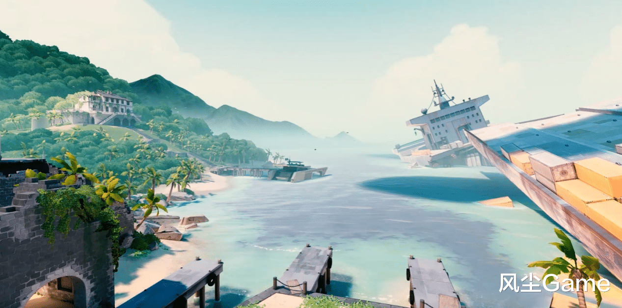角色设计诚意满满,地图打造同样煞费苦心。为保障竞技性,地图主体部分必须简洁克制,但在那些不可互动的区域,设计师们得以大展身手:微风岛屿里,阳光穿透棕榈叶洒下斑驳光影,尽显海岛风情;亚海悬城中,整座城市漂浮于空中,带来震撼的视觉奇观;霓虹町高低错落的建筑布局,勾勒出赛博都市的独特轮廓。