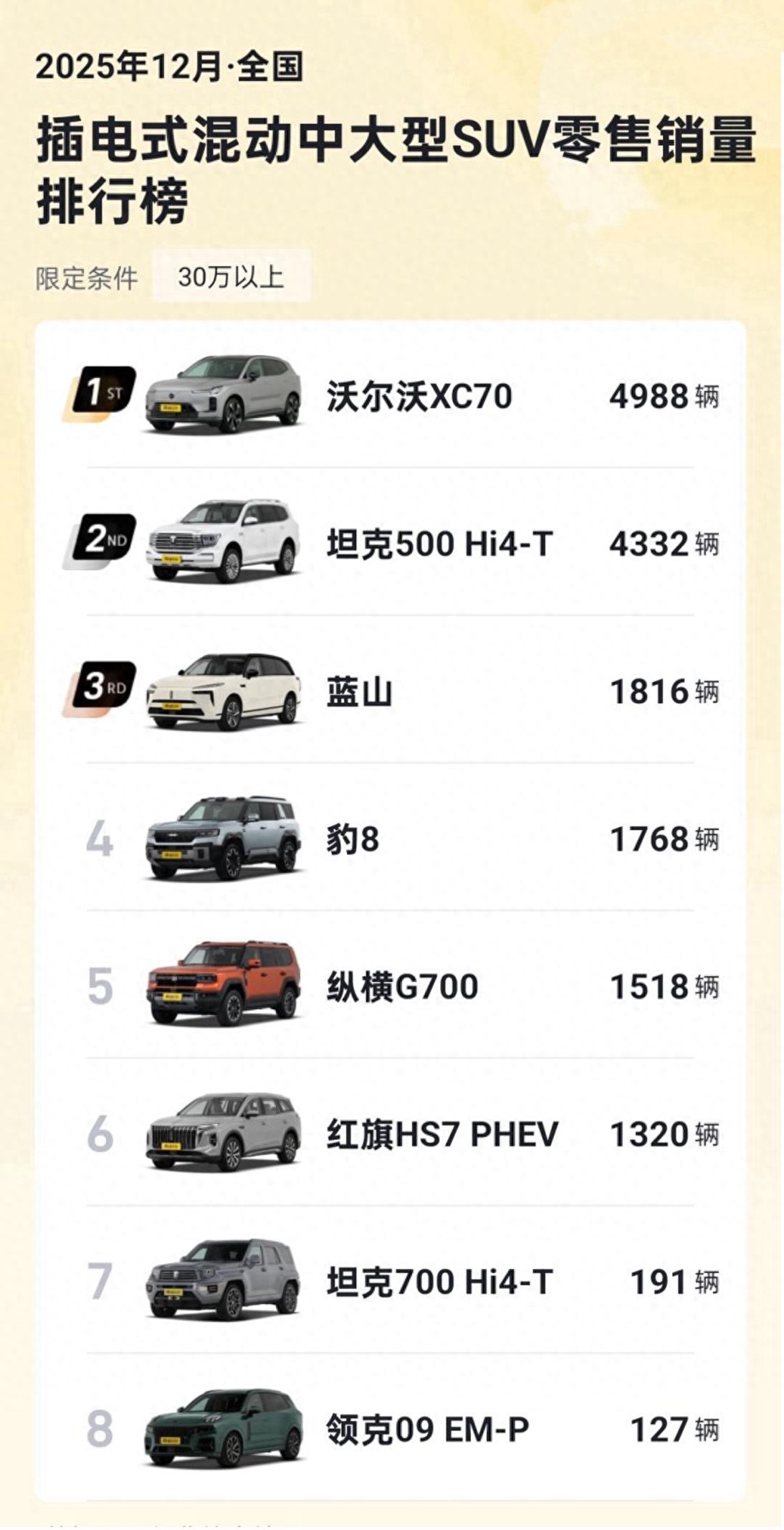 大家都知道,在30万级豪华SUV市场中,奥迪Q5L长期占据着重要地位,其品牌认知度和均衡表现吸引了不少消费者,然而,随着沃尔沃全新XC70携“超级混动”技术的登场,市场格局可以说悄然发生了变化——全新XC70不仅12月单月销量达4988台,蝉联品牌销冠,更已获得超过1.4万位车主的真实认可。