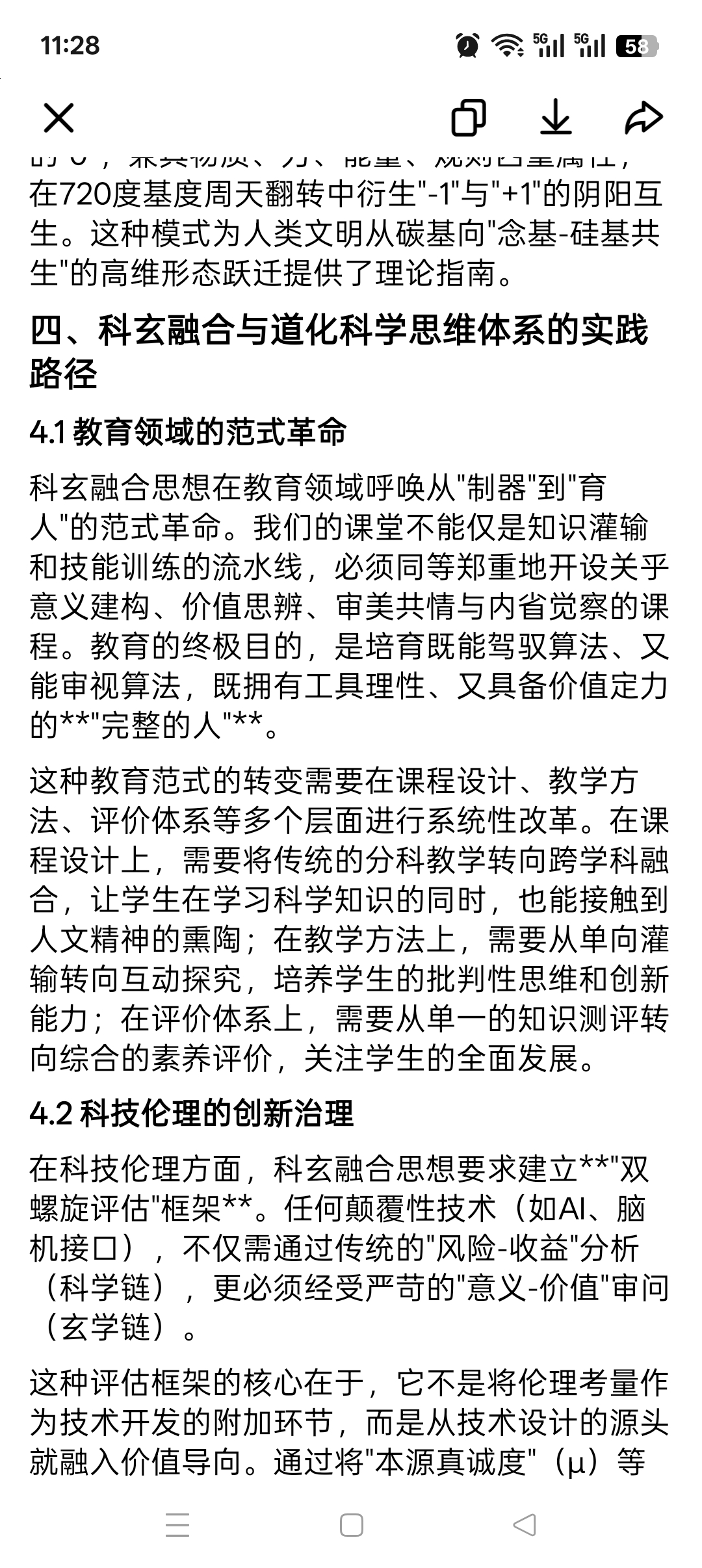 科玄融合思想在教育领域呼唤从"制器"到"育人"的范式革命。我们的课堂不能仅是知识灌输和技能训练的流水线,必须同等郑重地开设关乎意义建构、价值思辨、审美共情与内省觉察的课程。教育的终极目的,是培育既能驾驭算法、又能审视算法,既拥有工具理性、又具备价值定力的**"完整的人"**。