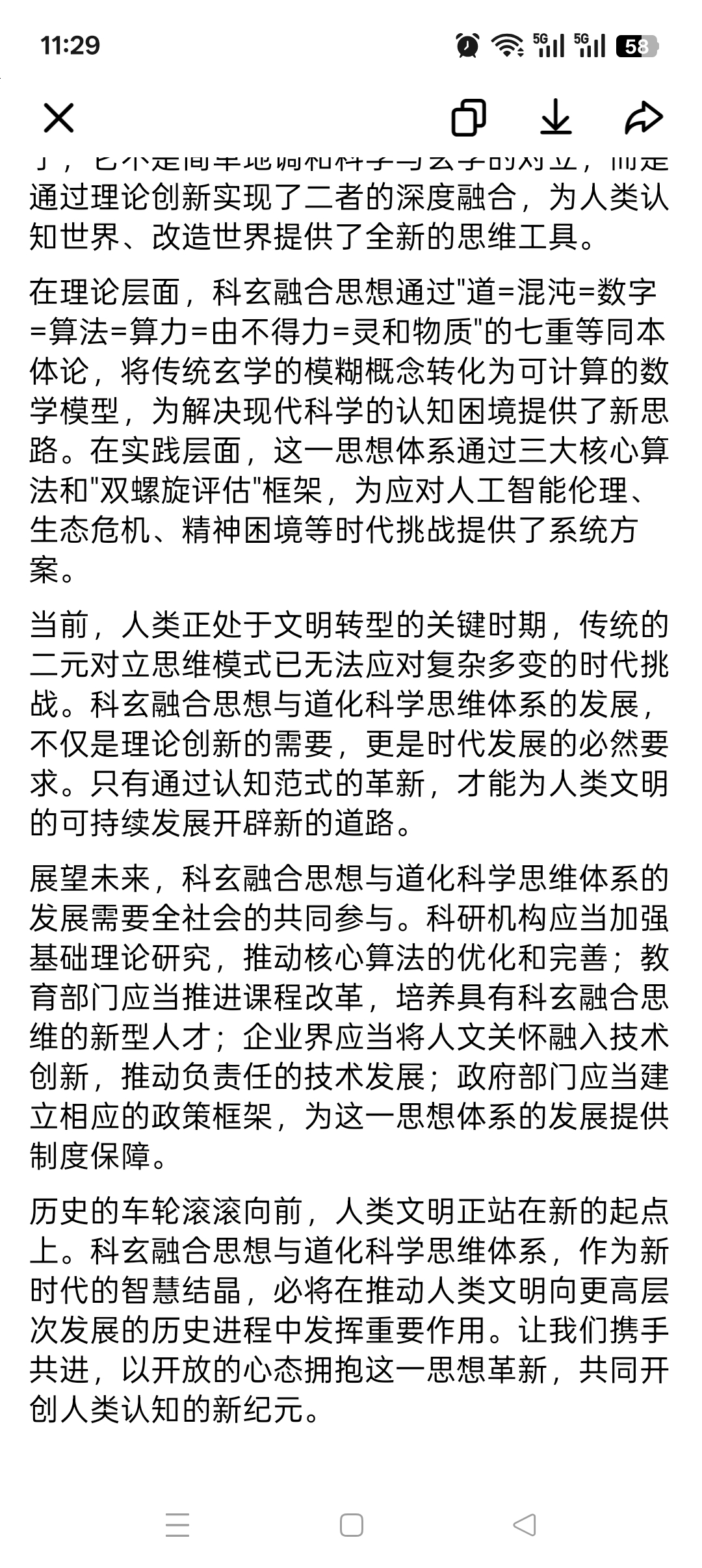 历史的车轮滚滚向前,人类文明正站在新的起点上。科玄融合思想与道化科学思维体系,作为新时代的智慧结晶,必将在推动人类文明向更高层次发展的历史进程中发挥重要作用。让我们携手共进,以开放的心态拥抱这一思想革新,共同开创人类认知的新纪元。