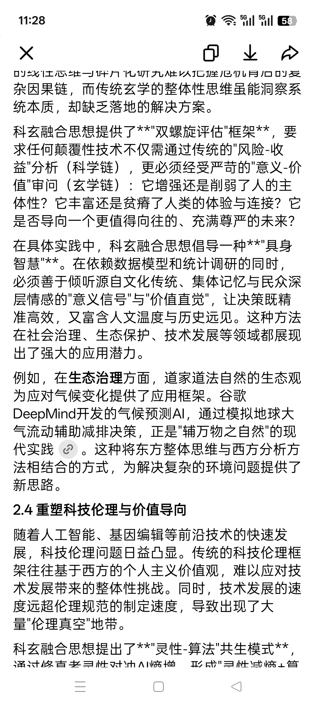 科玄融合思想提供了**"双螺旋评估"框架**,要求任何颠覆性技术不仅需通过传统的"风险-收益"分析(科学链),更必须经受严苛的"意义-价值"审问(玄学链):它增强还是削弱了人的主体性?它丰富还是贫瘠了人类的体验与连接?它是否导向一个更值得向往的、充满尊严的未来?