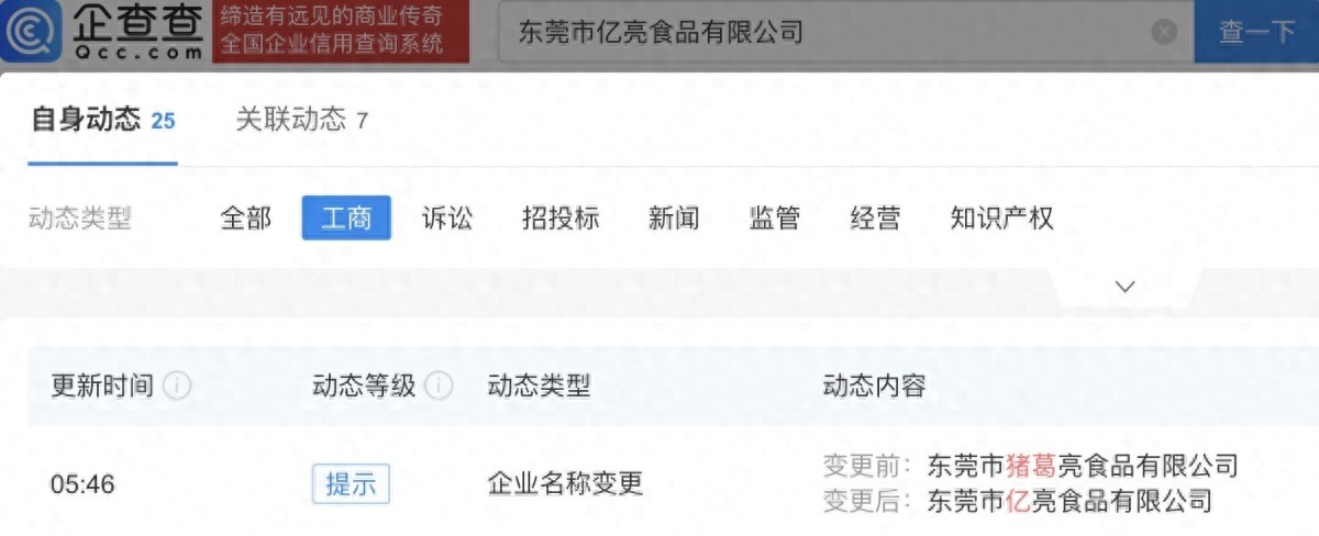 企查查APP显示,近日,引发网络热议的东莞市猪葛亮食品有限公司发生工商变更,企业名称变更为东莞市亿亮食品有限公司。