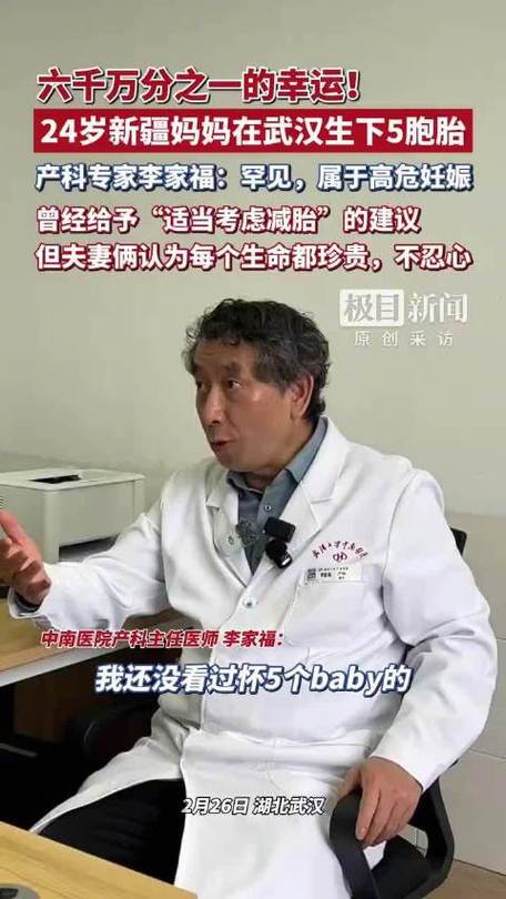 此次分娩的五胞胎为1男4女,概率仅约六千万分之一,堪称生命奇迹。迪丽因多囊卵巢综合征受孕不易,自然怀上五胞胎本是天大惊喜,却也伴随极高风险。多胎妊娠属于高危妊娠,早产、产后出血、胎儿发育不良等并发症概率远高于普通孕妇,当地医院建议她前往医疗条件更完善的医院待产。在其他宝妈的推荐下,迪丽和家人跨越数千公里从新疆来到武汉,专程找到李家福医生团队寻求帮助。