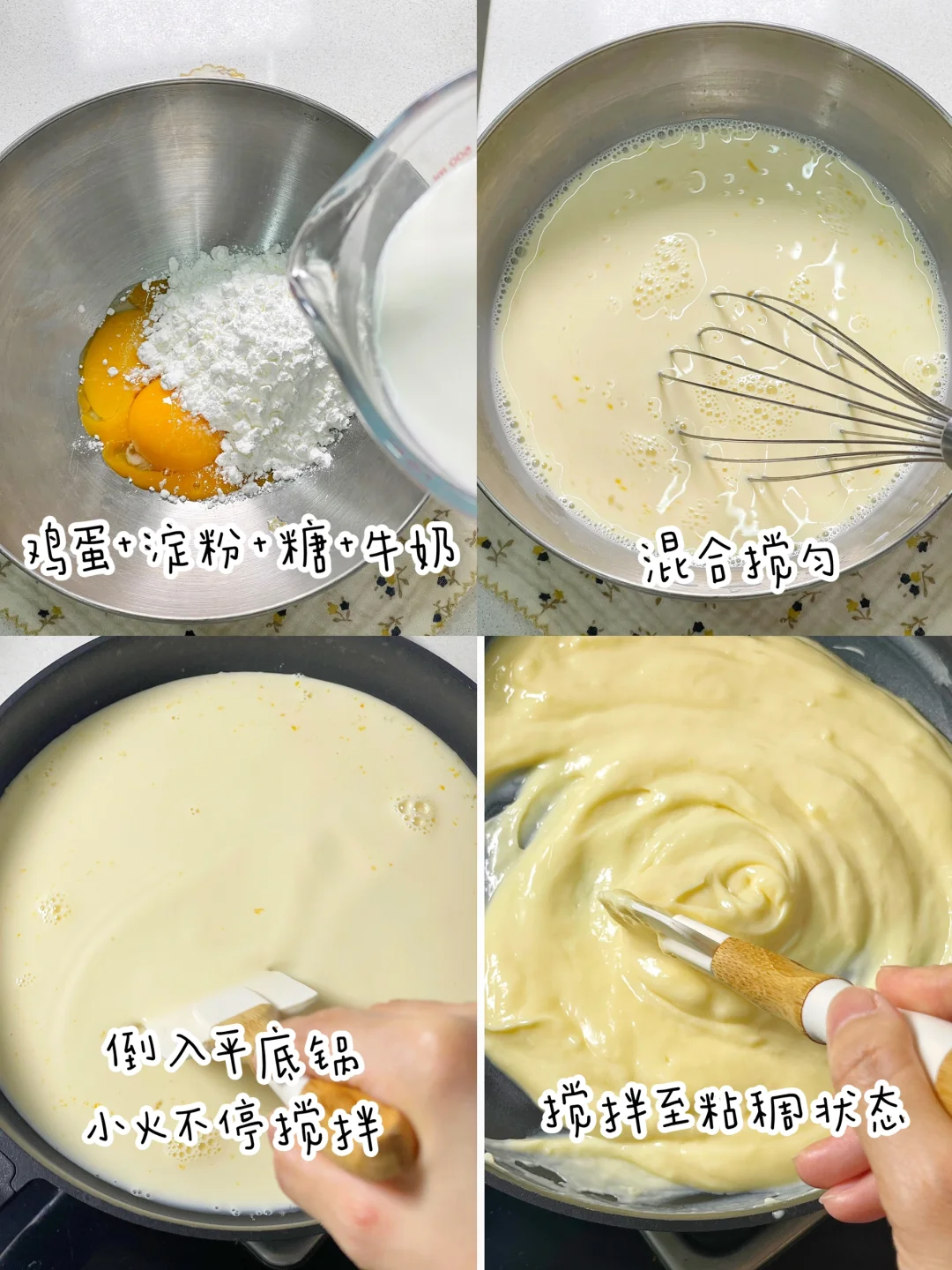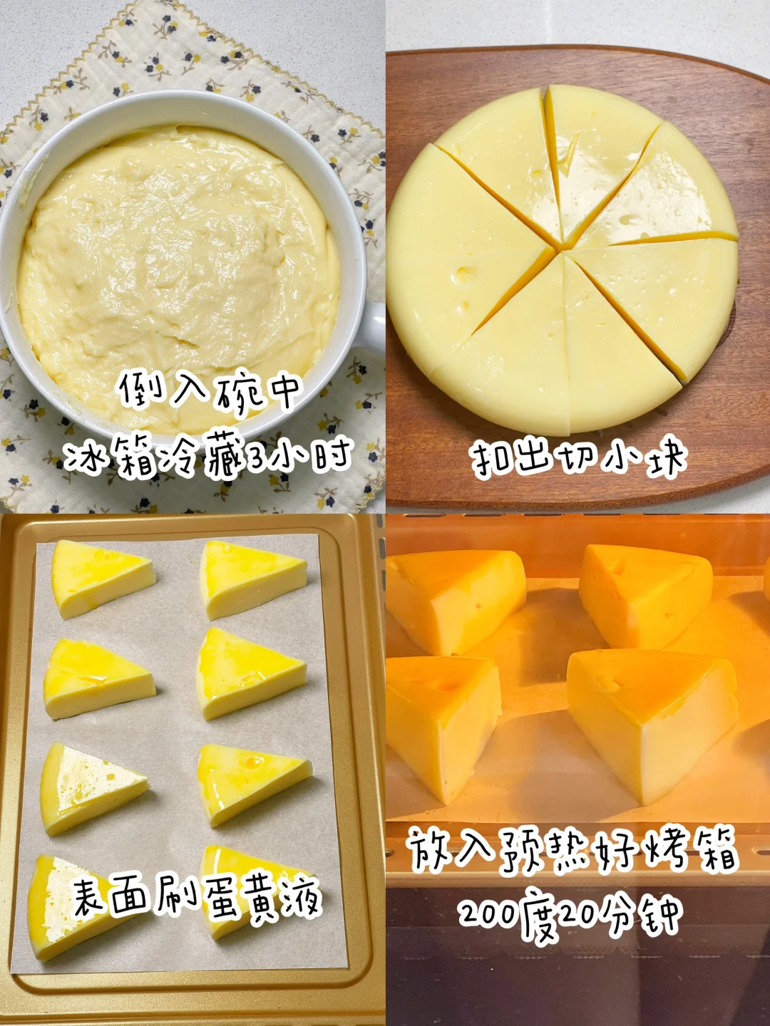 分享一款好吃的烘焙小甜品做法,第一次吃就被惊艳到了,奶香浓郁,外焦里嫩,弹弹的口感太绝了,真的是大人小孩都爱的小甜品,做法也很简单哦,找时间试试看吧! ✅准备食材: 牛奶400毫升、淀粉40克、砂糖20克、蛋黄2个。 ✅制作方法: 🔹所有食材混合搅匀倒入平底锅,开小火顺时针不停搅拌,搅拌至粘稠状态,倒入大碗中,盖上保鲜膜放入冰箱冷藏2个小时以上。 🔹取出切均等大小,表面均匀的刷上蛋黄液,放入预热好的烤箱,上下管200度烤20分钟即可。