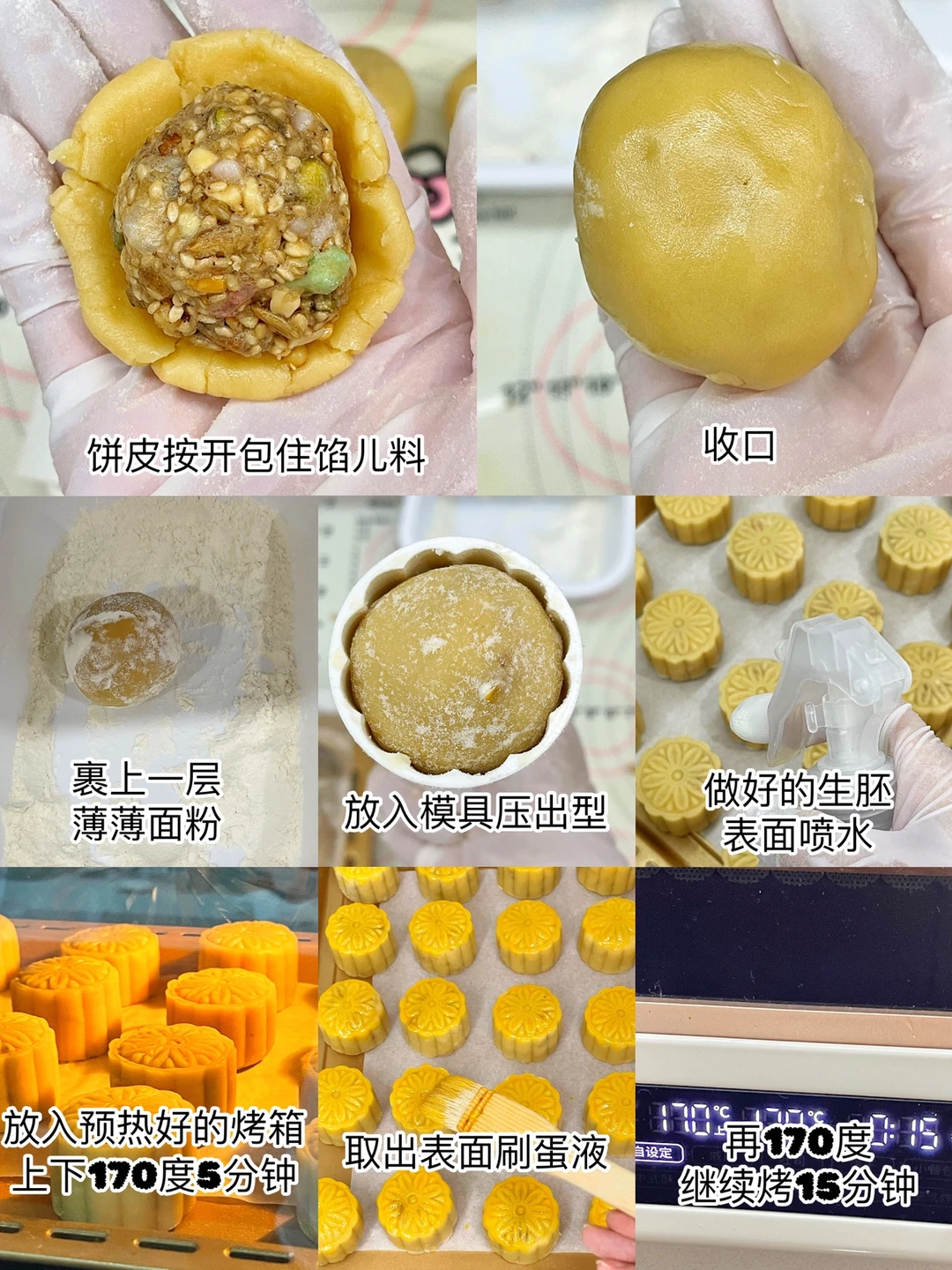 ✅做好的月饼生胚表面喷水,放入预热好的烤箱,上下温度170度先烤5分钟定型,取出表面刷蛋黄液,再继续烤15分钟就可以啦,放凉晾透,放置24小时回油就可以吃啦。
