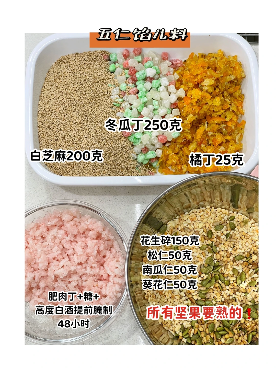 肥肉丁150克+150克白糖+40克高度白酒提前腌制48小时.