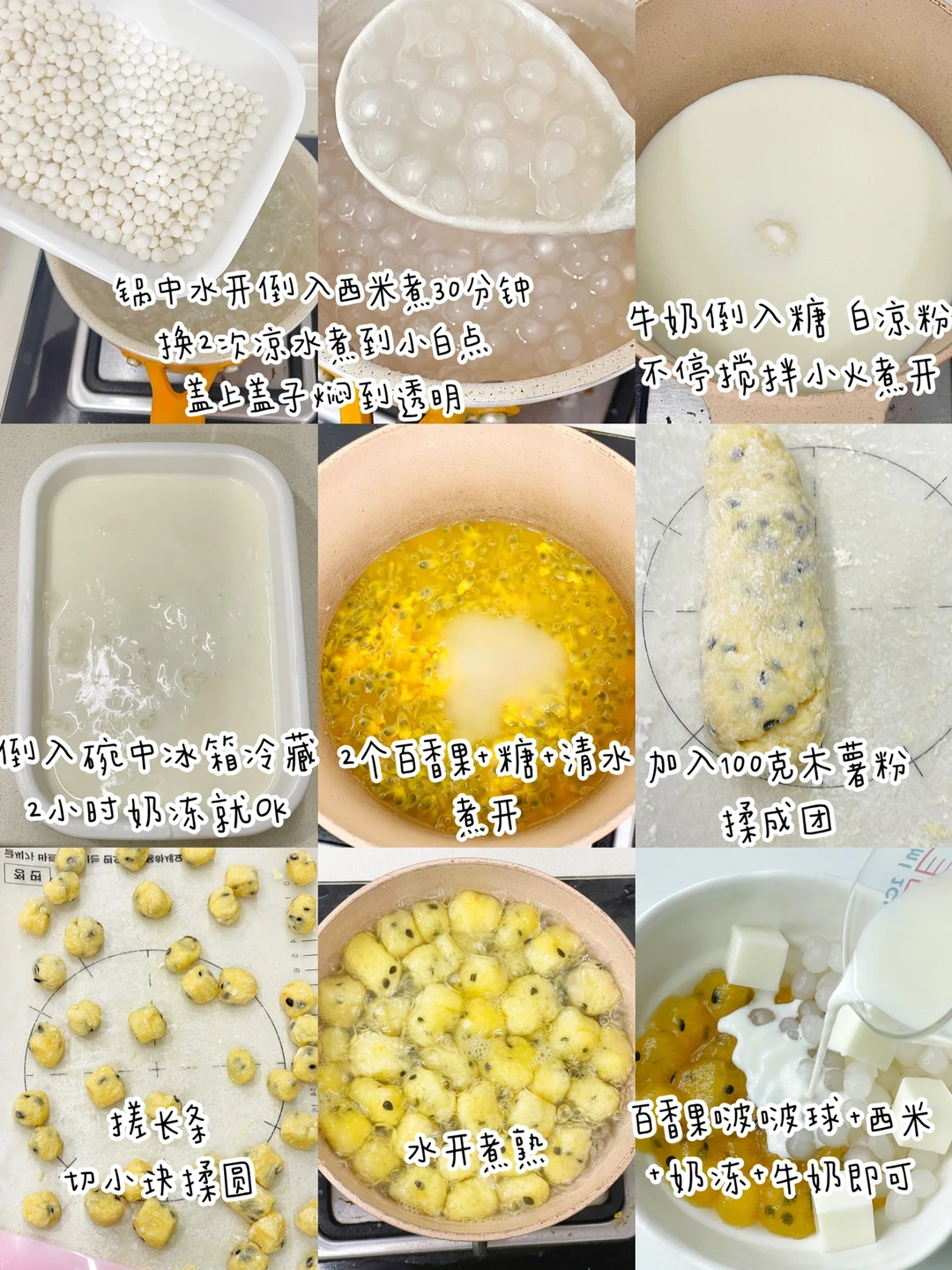百香果啵啵球:2个百香果汁+糖20克+木薯淀粉100克+清水30克煮沸,放入木薯淀粉揉成团,搓长条切小块揉圆,水开后煮熟过凉水即可。