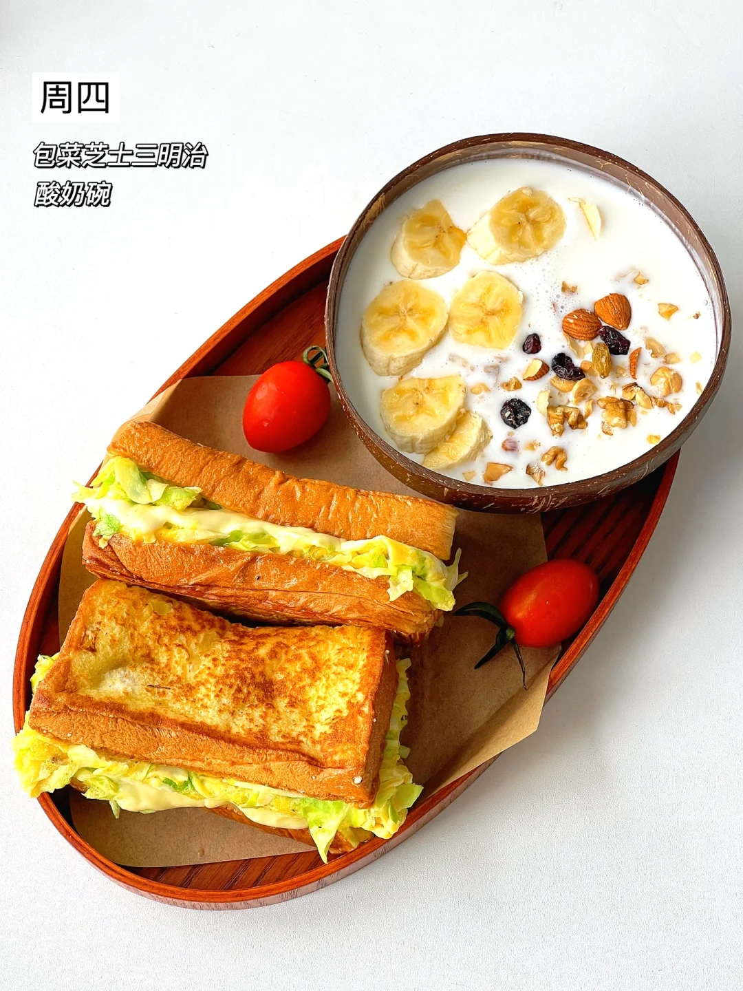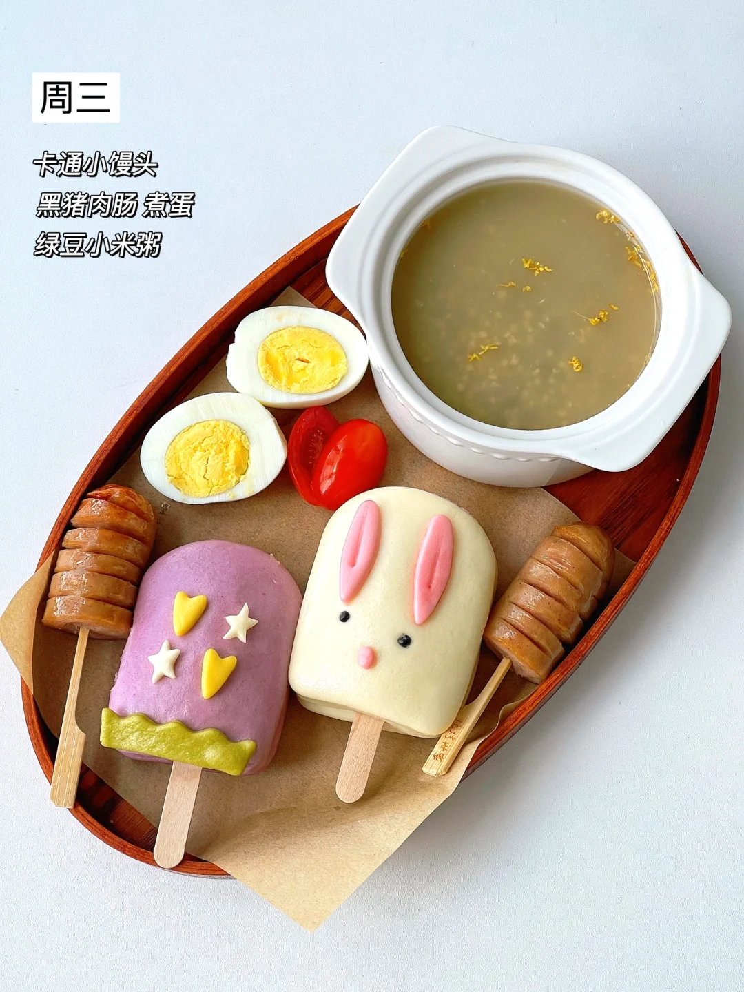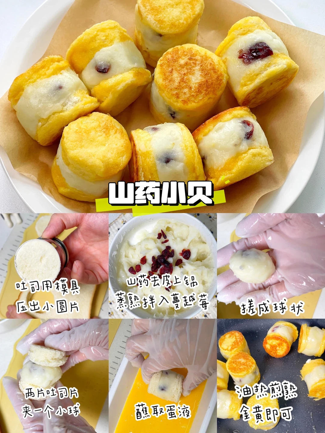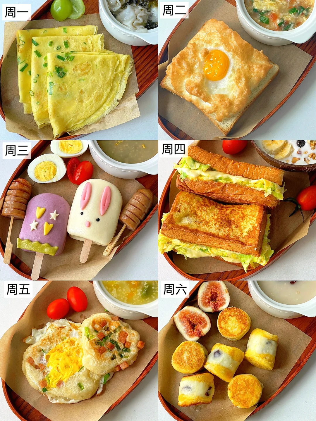 不知道早餐给宝宝做啥的,可以参考今天这一篇哈,快手好做又有食欲,做到每天不重样[偷笑R] ✅周一:香葱鸡蛋薄饼、鲜肉小馄饨 🔹香葱鸡蛋饼:4颗鸡蛋+少许盐搅匀。加入半碗面粉、适量清水搅拌至无颗粒状,加入葱花拌匀。锅中倒油,油热舀入一勺面糊,转动锅使面糊转成圆形,定型后翻面,两面煎熟即可。 ✅周二:火烧云吐司、番茄鸡蛋疙瘩汤 🔹火烧云吐司:蛋清蛋黄分离,蛋清里加适量糖打蛋器高速打发至有小尖角。涂在吐司表面,中间凹个小圈放蛋黄,放入预热好的烤箱,上下管180度10分钟。 番茄鸡蛋疙瘩汤:炒香蒜末放入番茄炒出汁水,倒入生抽,倒入适量清水,等水开的时候调疙瘩。150克面粉打入一个蛋清,顺时针搅拌成小疙瘩。汤煮开放入小疙瘩,煮2分钟,放入青菜,淋上鸡蛋液,加盐和香油调味即可。 ✅周三:卡通小馒头、黑猪肉肠、煮蛋、绿豆小米粥 🔹卡通小馒头:可可爱爱的小馒头无需解冻,直接水开上锅蒸6分钟。 ✅周四:包菜芝士三明治、酸奶坚果碗 🔹包菜芝士三明治:包菜切细丝,打入2个鸡蛋,加黑胡椒盐调匀,锅中倒油,倒入包菜鸡蛋液,放入吐司(翻一下面两面都沾上蛋液)小火煎至蛋液凝固,翻面,把避免折起,放上芝士片,对折起来即可。 ✅周五:发面鸡蛋饼、南瓜小米粥 🔹发面鸡蛋饼:面粉200克+2克酵母+10克糖+盐2克+160克清水搅拌均匀,盖上盖子醒发至2倍大。锅入倒入油,手上沾油揪一个面团直接放入锅中,按成中间凹的饼状,打上鸡蛋,放上葱花和午餐肉丁,盖上盖子,小火焖至底面微黄,翻面盖上盖子继续焖至金黄即可。 ✅周六:山药小贝、牛奶燕麦粥 🔹山药小贝:山药去皮煮熟,碾压成泥放入适量蔓越莓拌匀。依次搓成适量大小的圆球。 吐司用圆形模具压出型,两片中间放入山药球,按压一下,裹上蛋液,锅中油热各个面度煎一下至金黄即可。