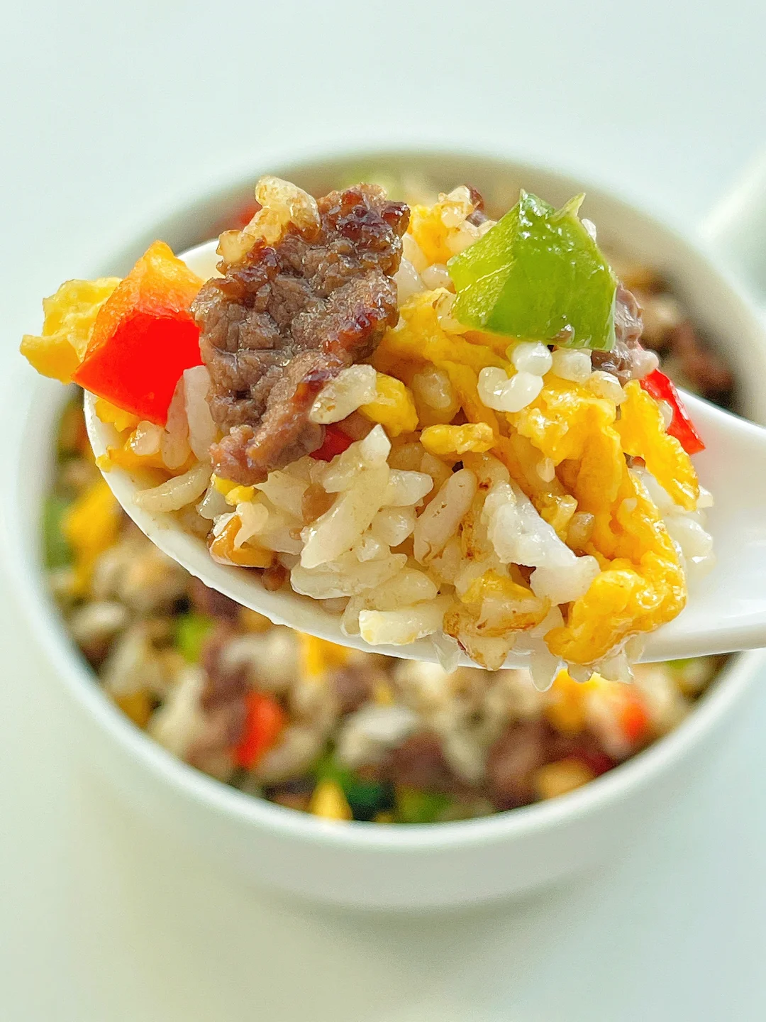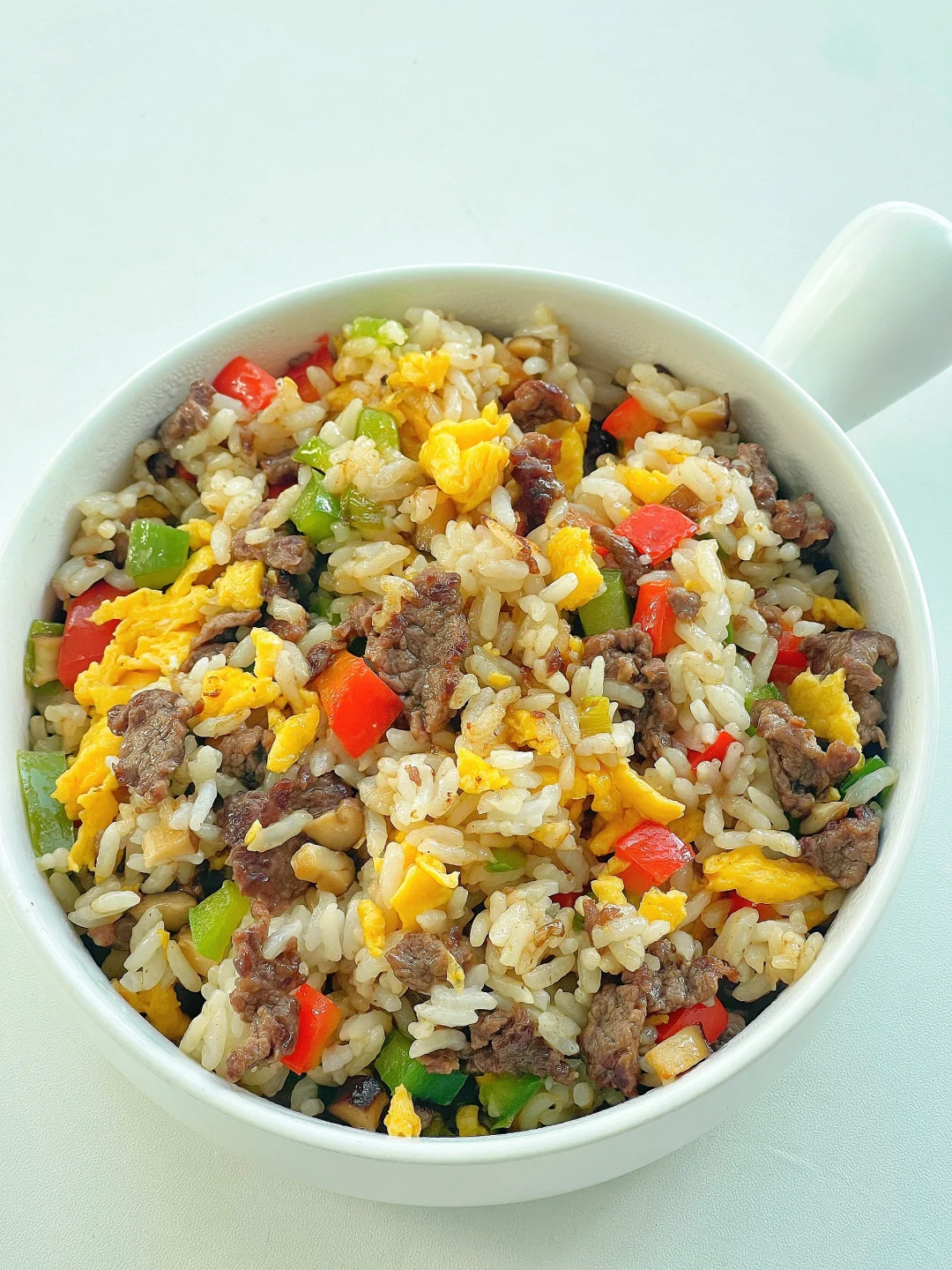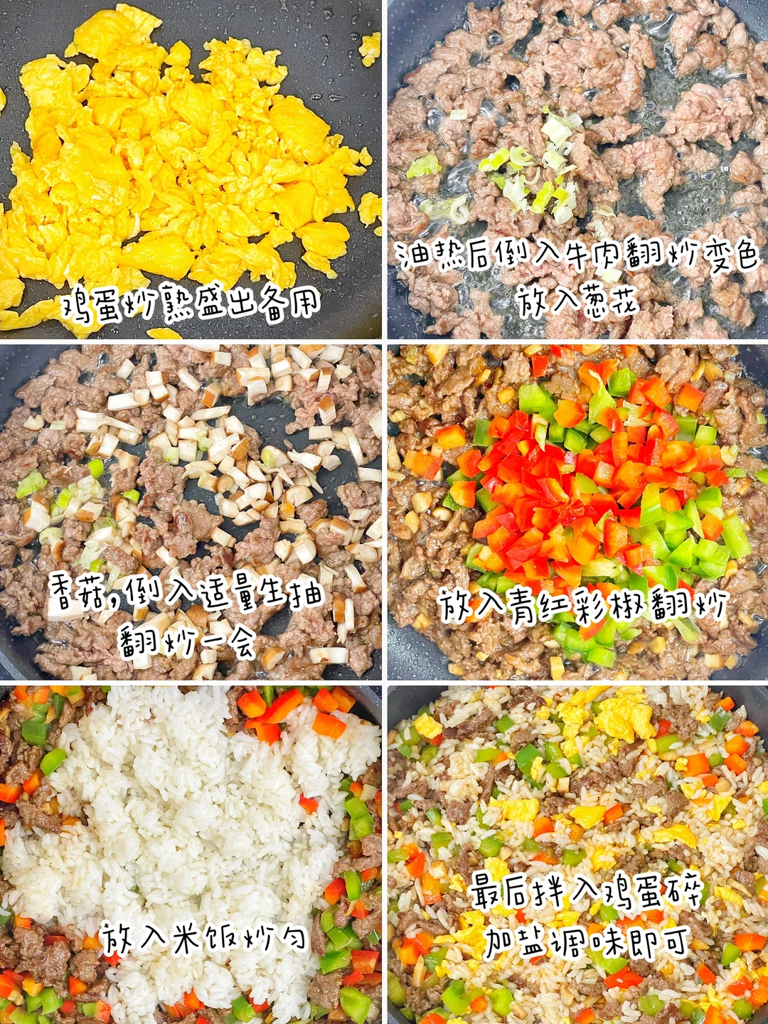 一定要给宝宝安排一次牛肉炒饭,真的巨好吃,宝宝一定会吃到光盘。一口下去有菜有肉有饭,营养💯。准备食材:牛肉、香菇、青椒、彩椒、鸡蛋。制作方法:牛肉切小薄片(用料理机打成肉末也可以),放生抽、淀粉、食用油、姜片抓匀腌制20分钟。鸡蛋炒熟盛出备用。锅中油热后倒入腌好的牛肉片,快速翻炒变色,放入葱花和香菇,倒入适量生抽翻炒一会,再放入青红椒翻炒一下,倒入米粉炒匀,最后拌入鸡蛋碎,加盐调味即可。