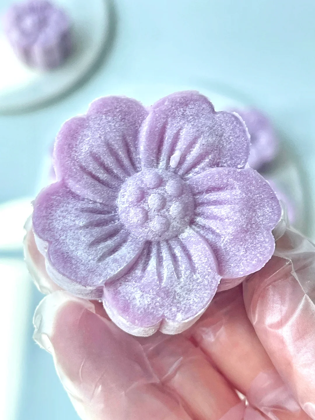 🔹取一个面团按平,中间放上馅儿料,收口裹圆,表面均匀的蘸上糯米粉,放进模具,扣出花型即可。