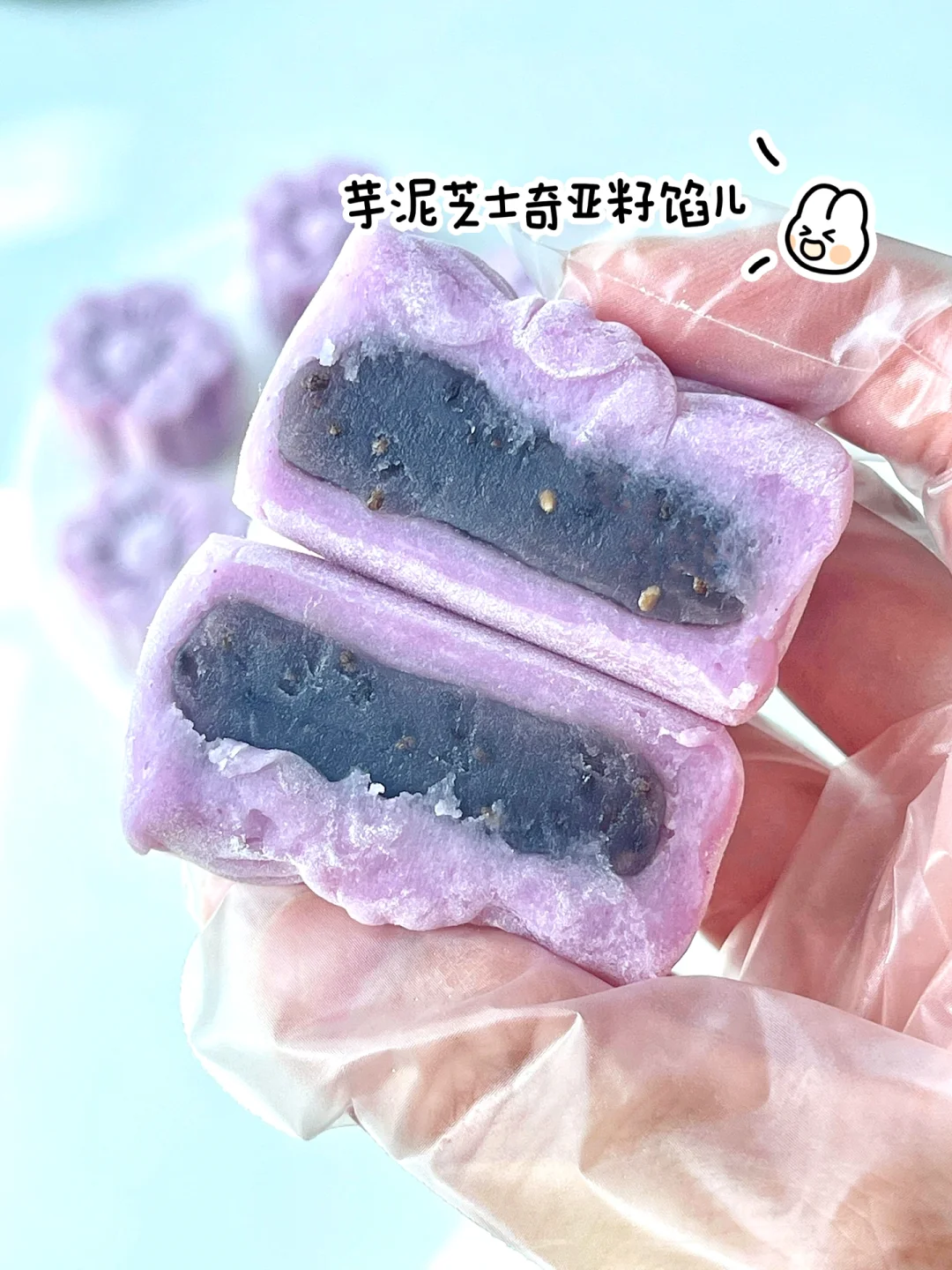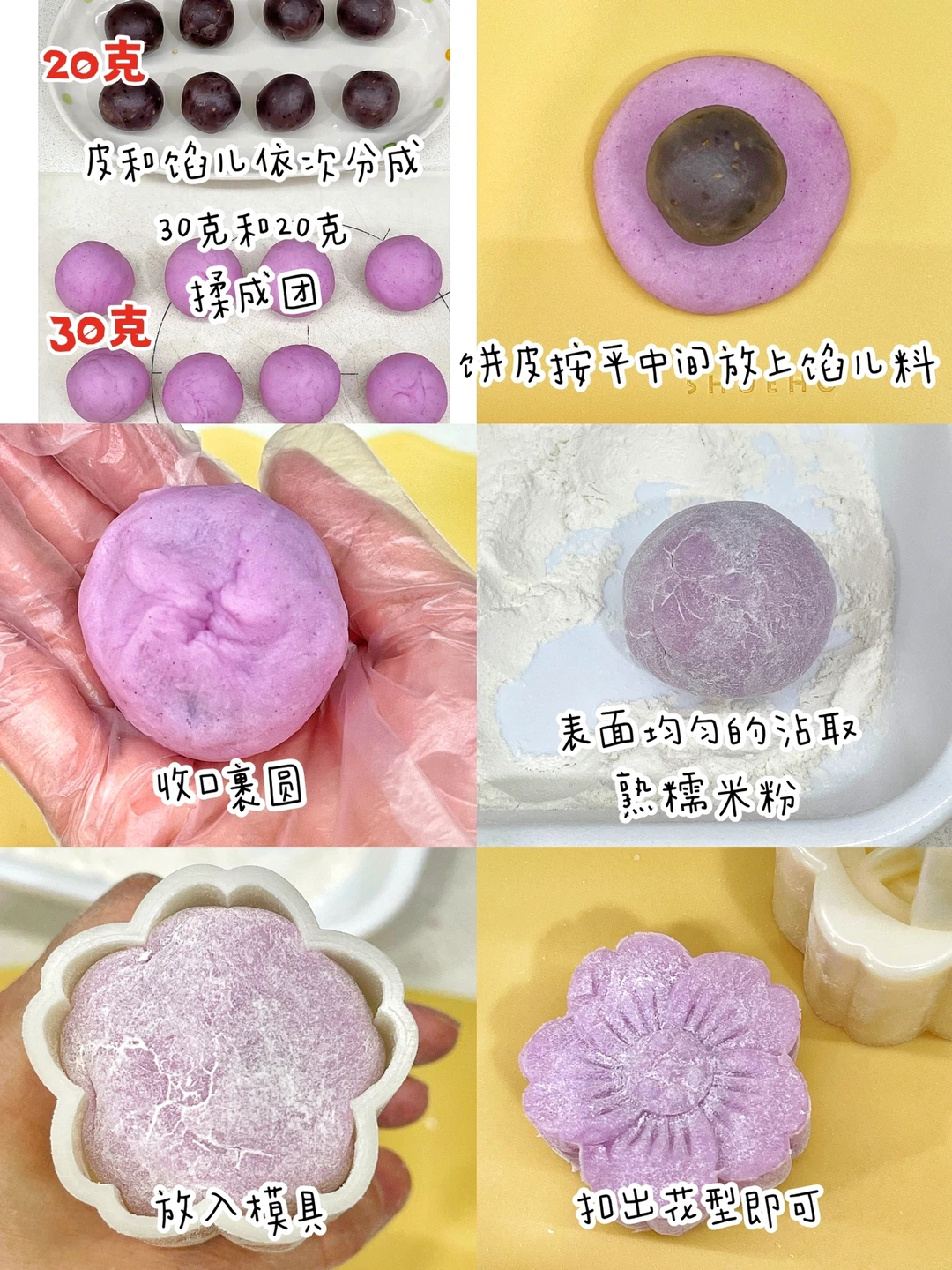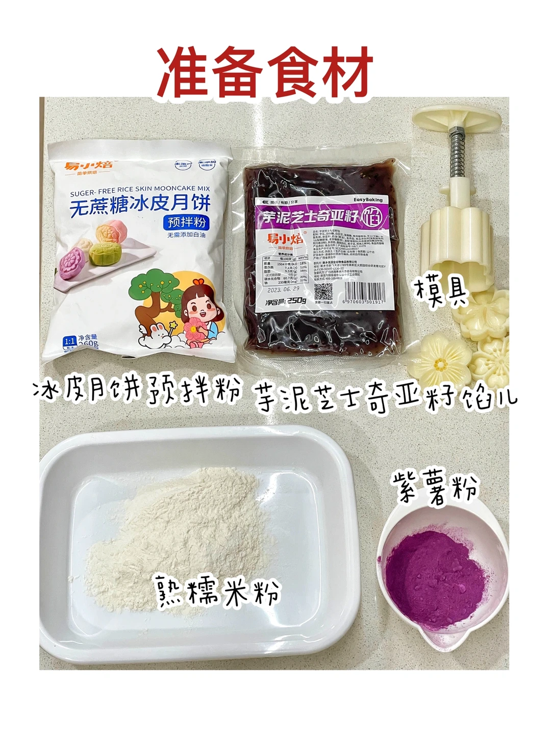 ✅准备食材:无蔗糖冰皮月饼预拌粉200克、 芋泥芝士奇亚籽馅儿料、熟糯米粉、紫薯粉10克、开水200克