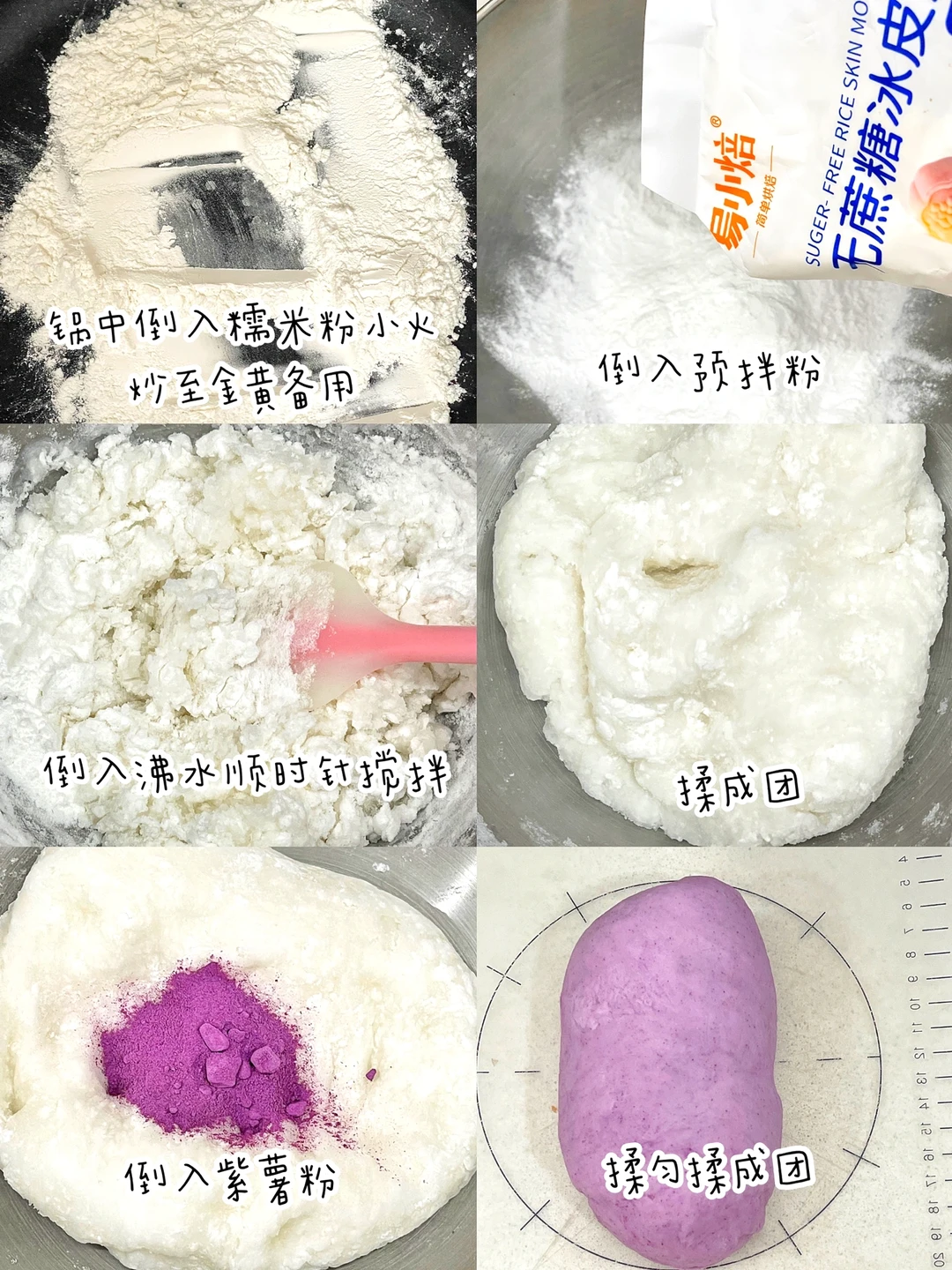 🔹预拌粉中倒入沸水,顺时针搅拌成团,倒入紫薯粉,揉成团。依次分寸30克大小揉成团。