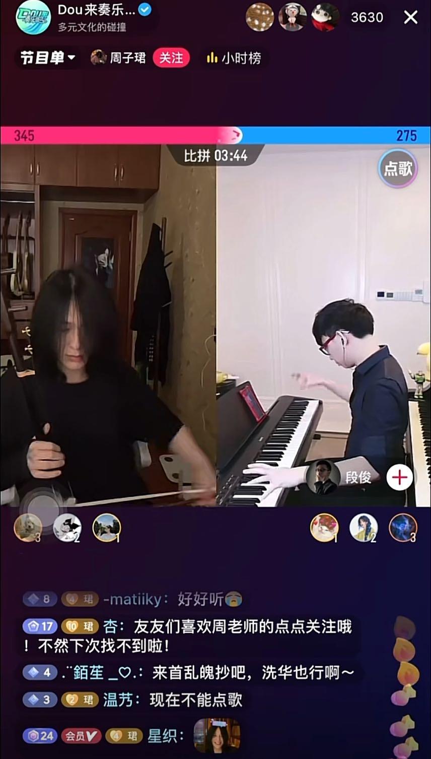 这是我见过最有趣的直播PK,它将西洋乐器和民乐完美结合,虽然民乐和西洋乐好像没有什么关系,但是一个直播PK却将它们完美结合在了一起。 抖音博主周子珺和段俊二人一个拉二胡,一个弹钢琴,实现了乐器的中西合璧,二人的直播没有胜负,只是为了进行艺术上的交流碰撞,从今年一月份以来,他们将《十年人间》、《何以歌》、《兰亭序》等音乐一一演奏,网友纷纷表示这才是最好的直播。虽然他们一个在成都,一个在重庆,但是却惺惺相惜,抖音平台给了他们线上合奏的机会。随着直播pk越来越火爆,艺术形式也更加多样化,这也是艺术的进步。 在最近抖音也为他们拍摄了纪录片《我的直播日记》,在他们直播,引得网友万千好评的背后,更是他们的辛勤学习。 他们PK的意义不仅在于中西方文化更好地进行交流,促进艺术的进步,更体现了他们想做好音乐的真心。#90后大学教师与二胡乐手斗琴百场#