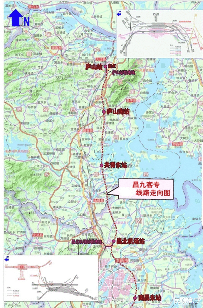 京港高铁九江至南昌段,线路自既有庐山站引出,向南经庐山市、共青城市、永修县、昌北机场后接入在建昌景黄高铁南昌东站至京港高速铁路南昌至赣州段何家线路所,线路长137公里,其中新建线路长度133.6公里。昌九高铁正线设桥梁58座、隧道21座,桥隧比为82.17%。全线设庐山、庐山南、共青城东、昌北机场、南昌东5座高铁车站,其中庐山站、南昌东站为接轨站。设计时速为350公里/小时,工程估算总投资315.9亿元。