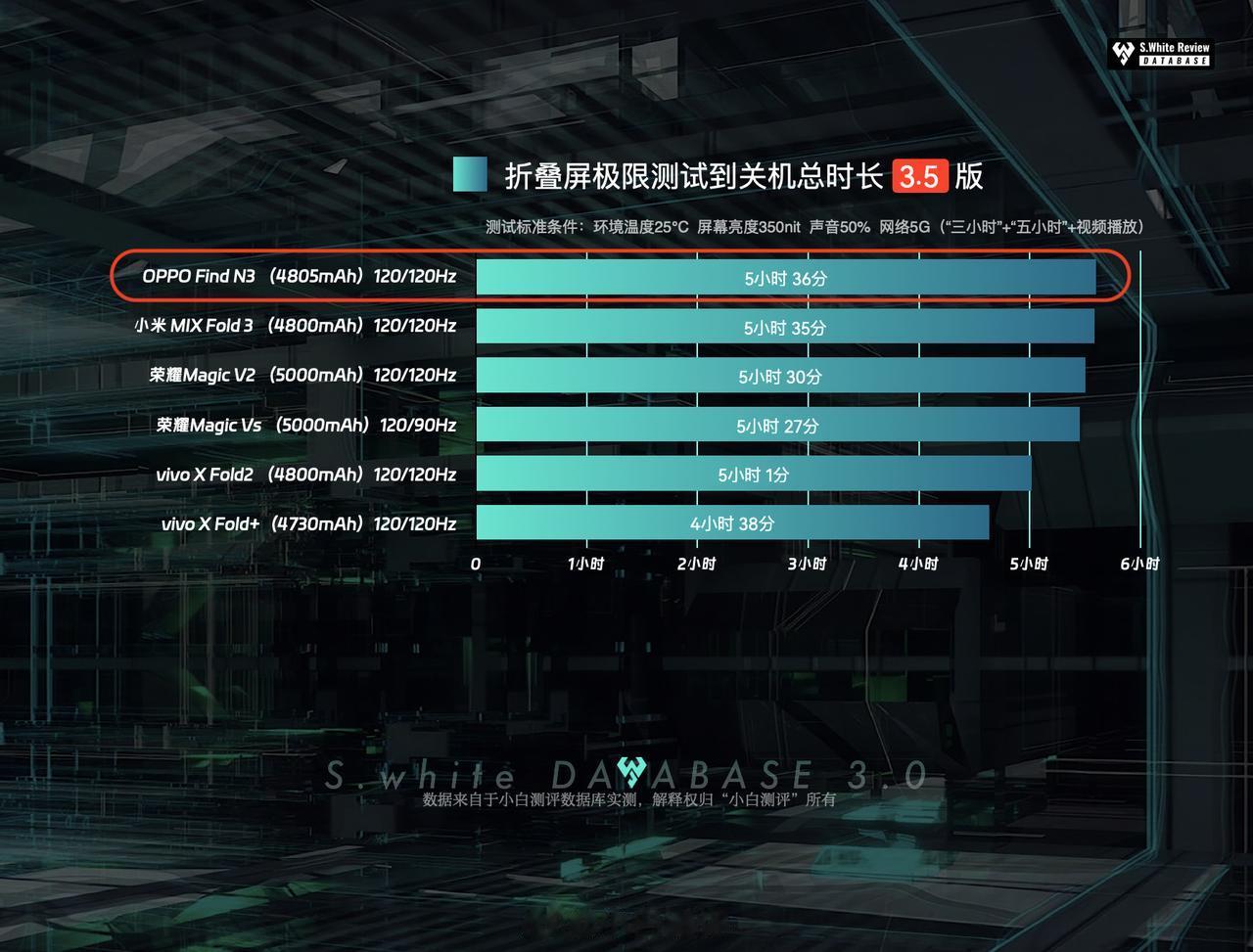 折叠屏手机的续航不再是短板了?这下子看来稳了!看了一下小白测评的折叠屏专项续航测试,感觉现在折叠屏的续航普遍都提升上来了,跟直板手机的差距不大了,其中表现最突出的是OPPO Find N3这款。 通过实测数据可以看到,3小时续航测试后,剩余电量为59%,极限测试下的续航总时长为5小时36分,但需要注意的是,这是极限测试下的续航表现,跟多数人日常使用习惯还是有较大出入的,如果是轻中度使用的话,续航大概在7小时左右,一天一充足够了,加上还有67W闪充,日常用基本无需担心续航问题。#OPPO Find N3# #OPPO Find N3评测#