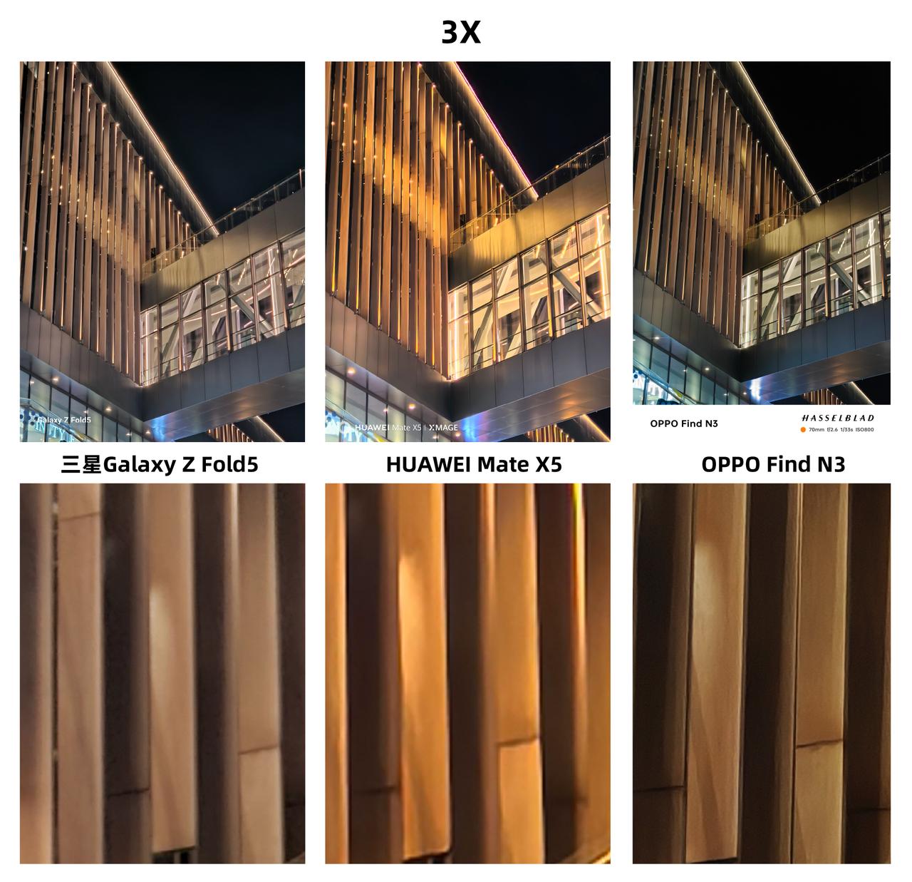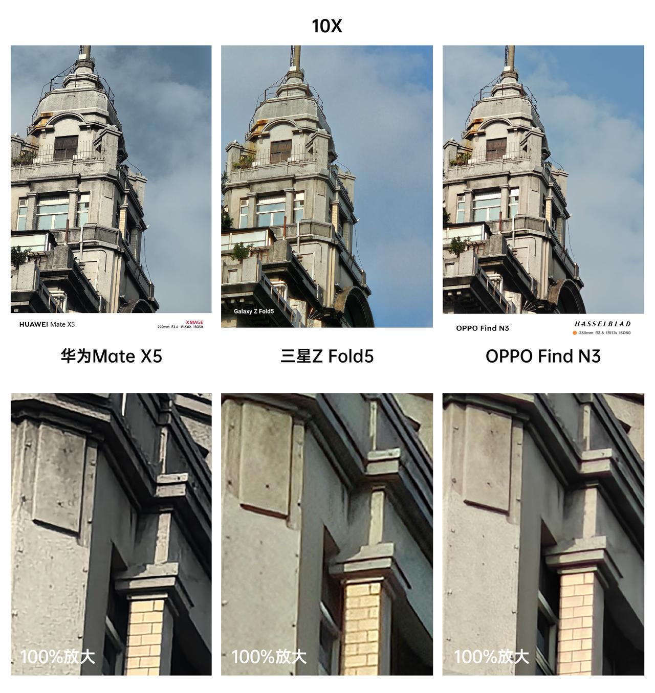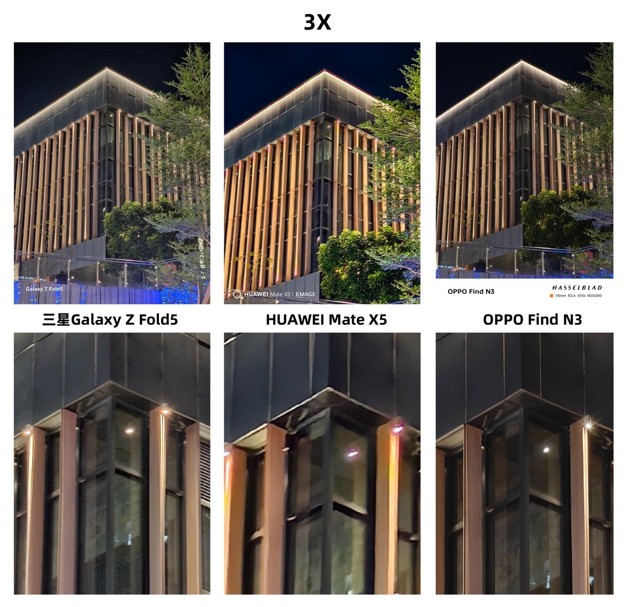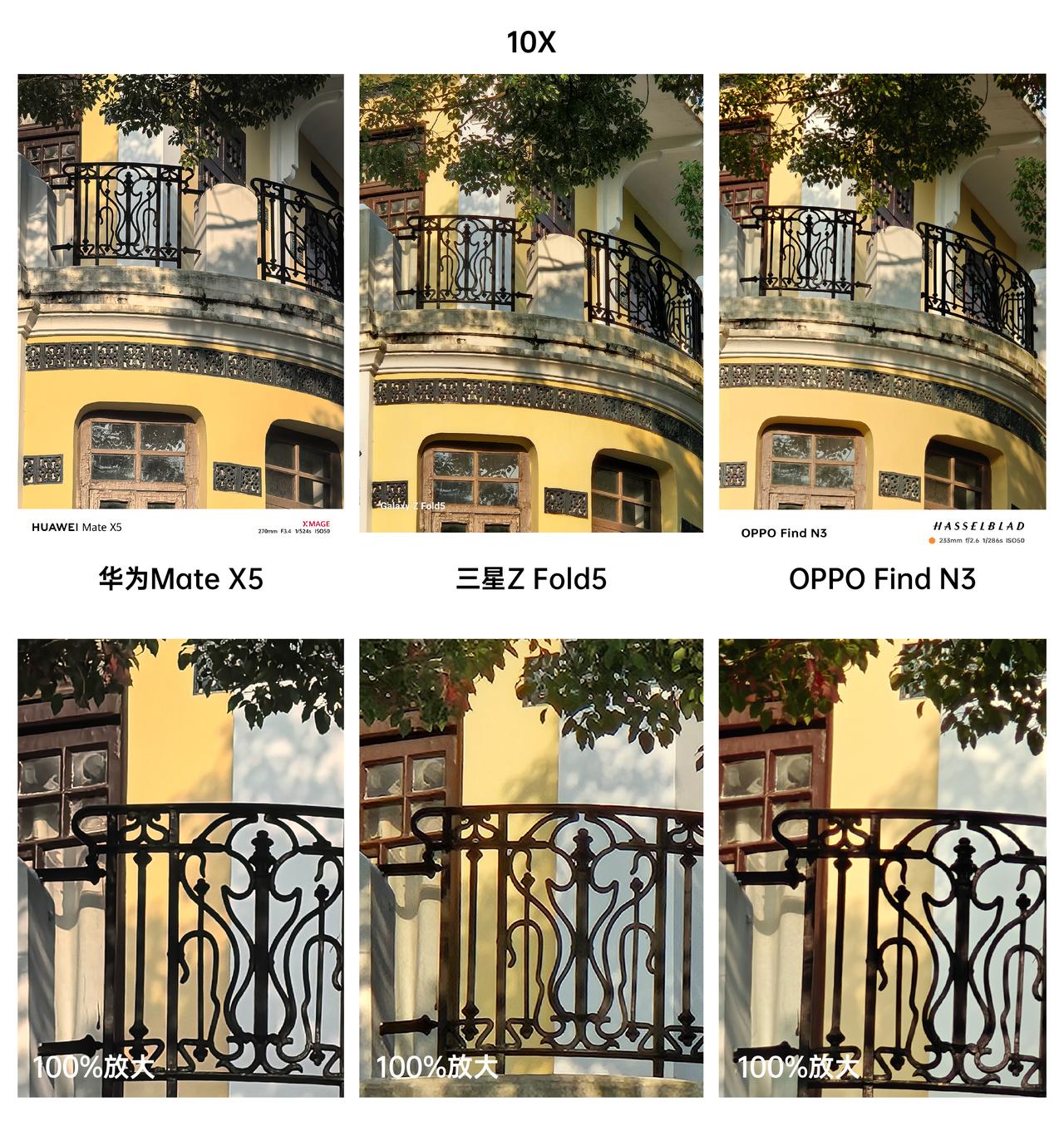 三款万元级折叠屏拍照对比,你觉得华为、三星和OPPO哪款更强? 首先是拍人像对比,我感觉这三款折叠屏手机拍出来的样张各有特色。华为Mate X5拍出来的脸部纹理更清晰,不过头发处抠图有点出错了;三星Z Fold5的抠图效果比较自然,人脸的皮肤看起来稍显白皙;OPPO Find N3拍出来的画面,看起来像精修了一样,确实有种精致感,估计这会是很多女性用户喜欢的人像效果。 得益于潜望长焦镜头的传感器尺寸更大,OPPO Find N3进光量更充足,所以记录下的细节会更丰富,通过100%放大后的样张就能看出来,Find N3拍摄的画面细节显然是要更丰富的,而且涂抹感没那么强,整体表现确实更好一些,大家觉得呢?#OPPO Find N3#