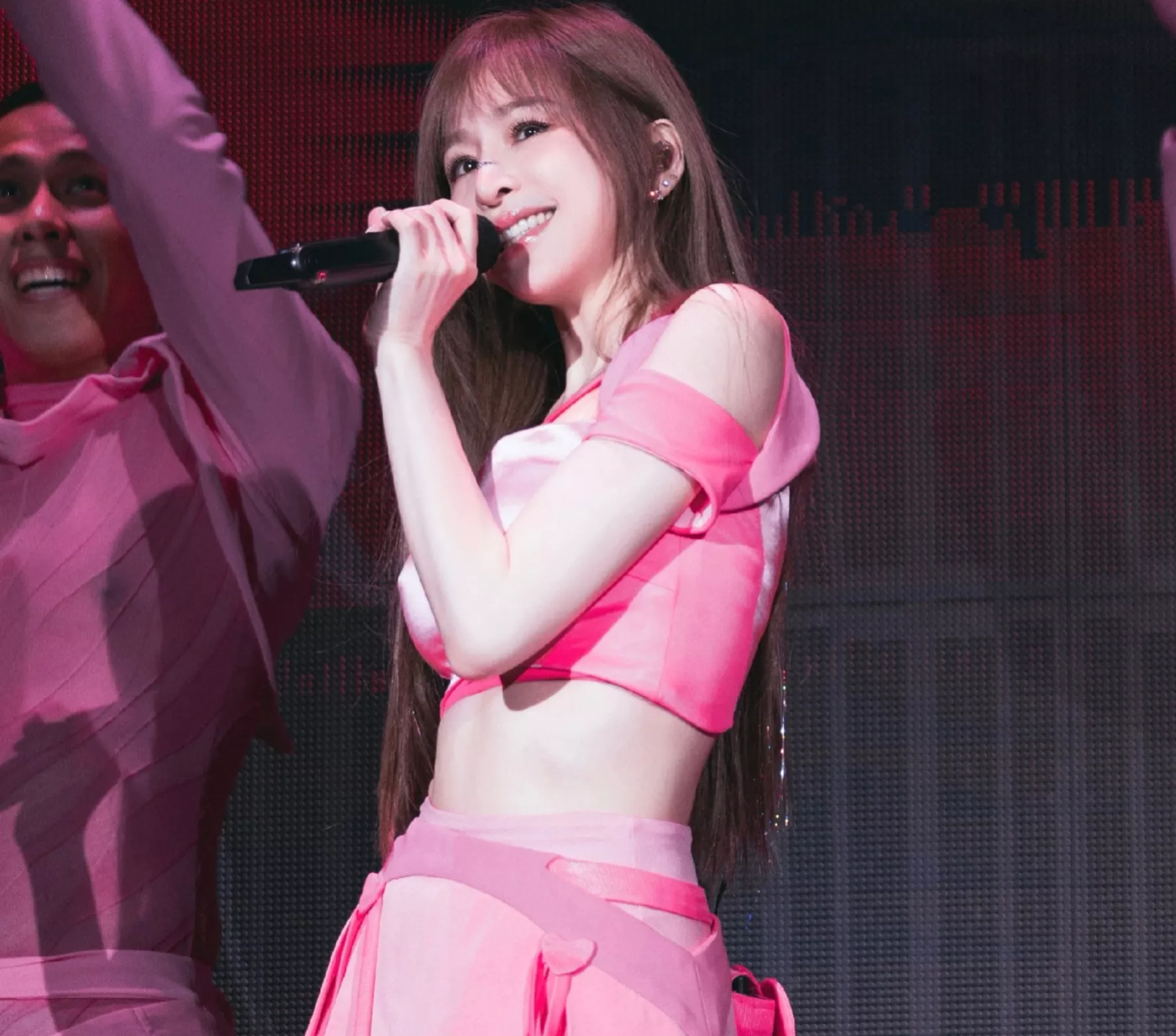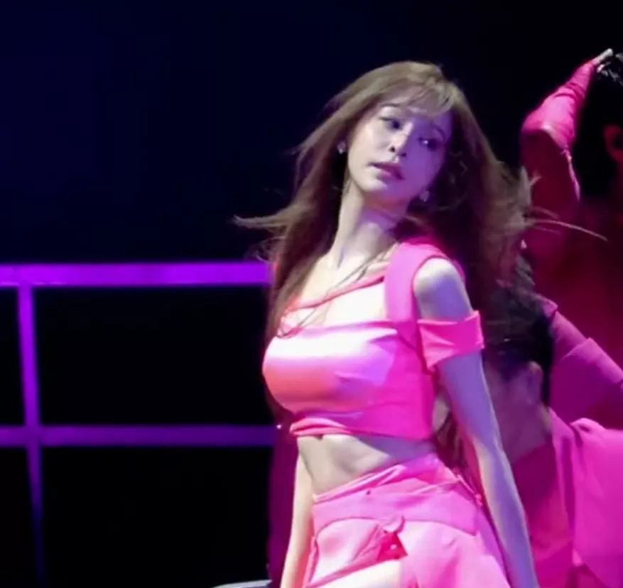 画面中,只见王心凌披着一头飘逸的长发,身穿粉色露腰的上衣,下搭同款系列的小短裙,脚下也是踩着粉色的靴子,打扮得很是少女。