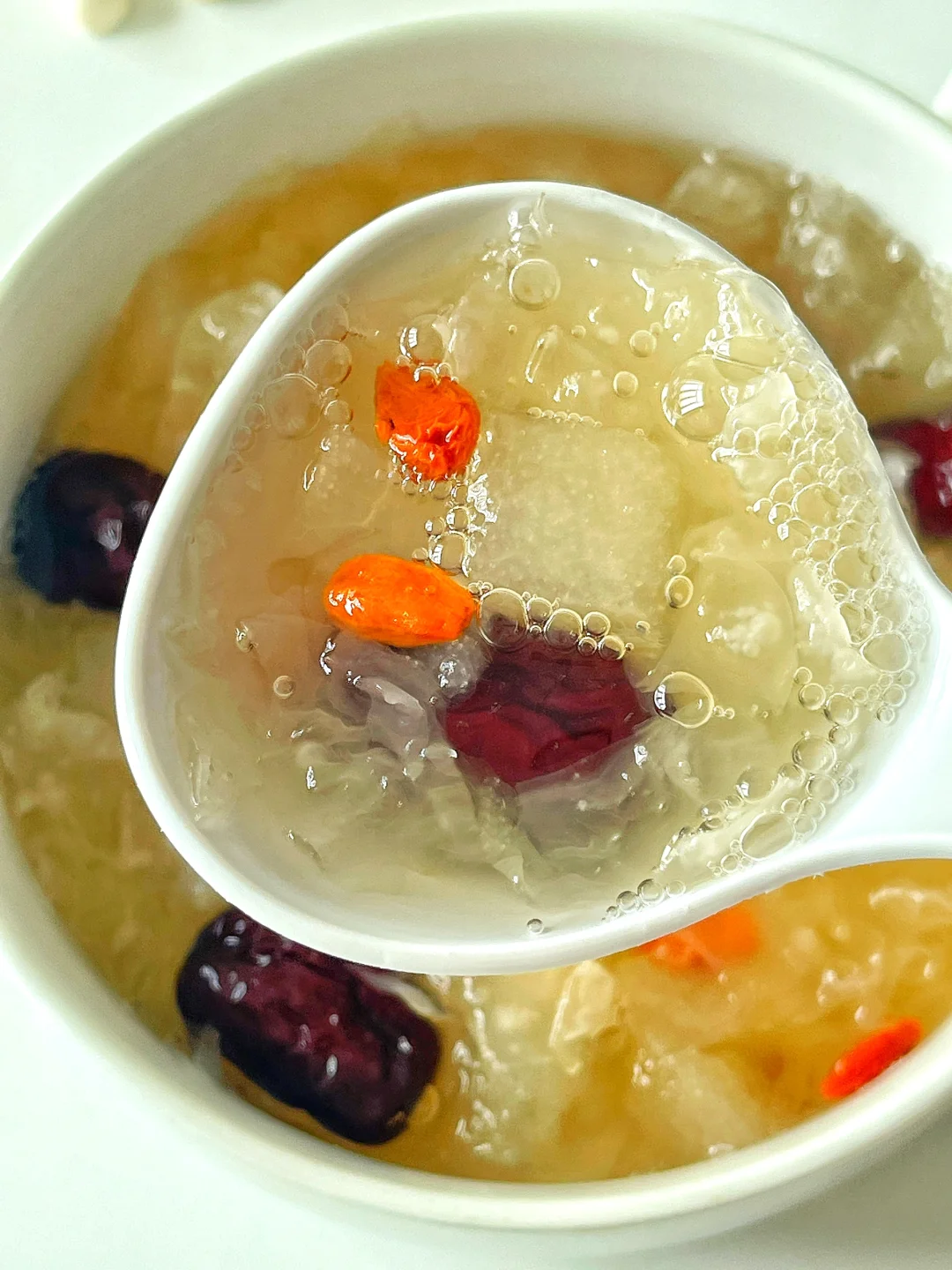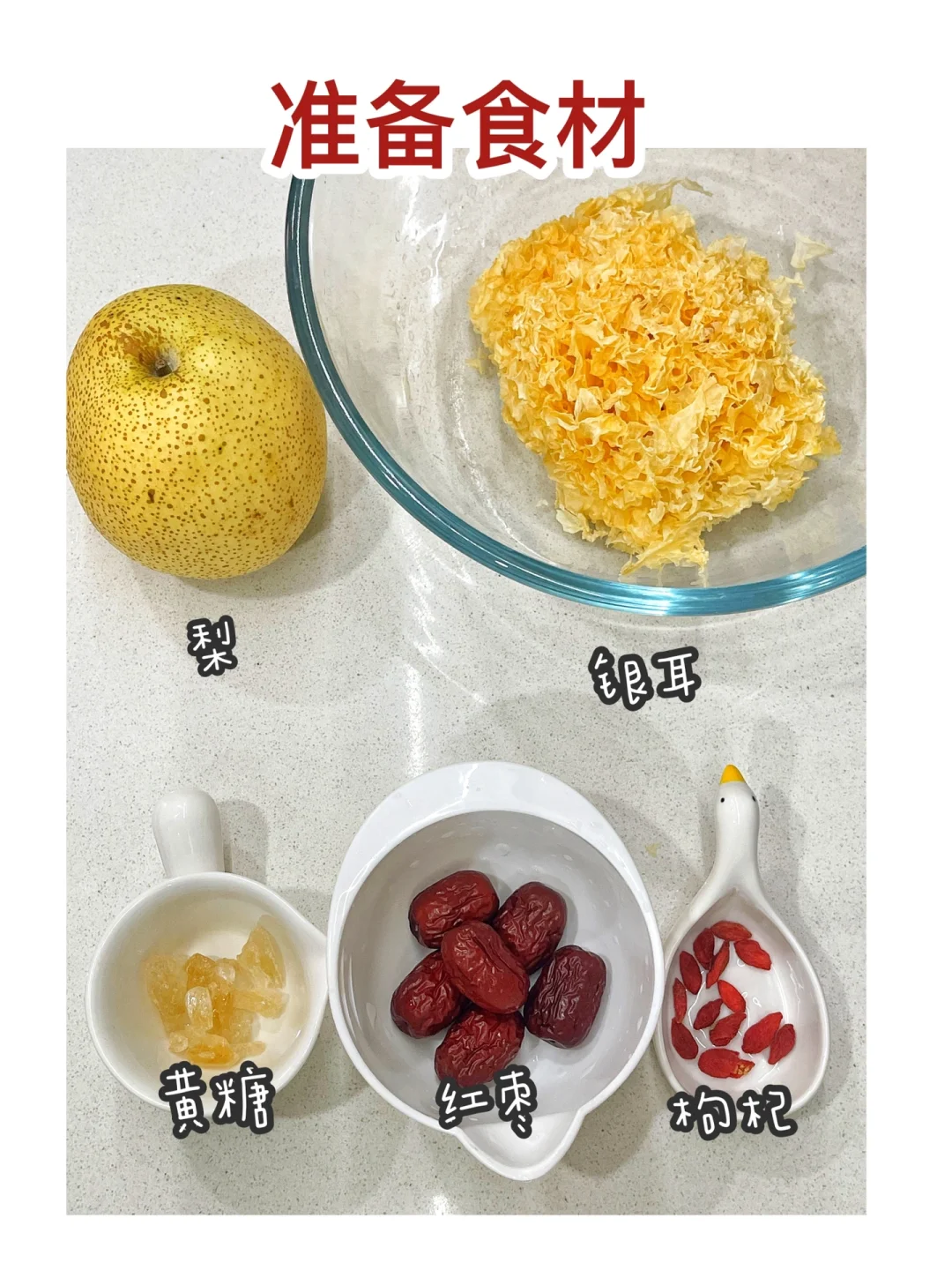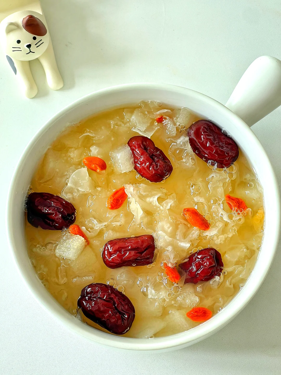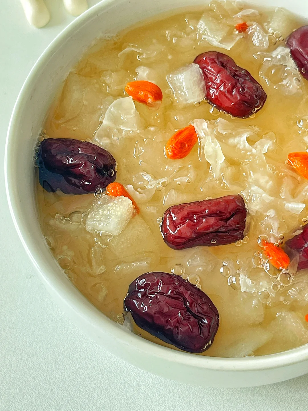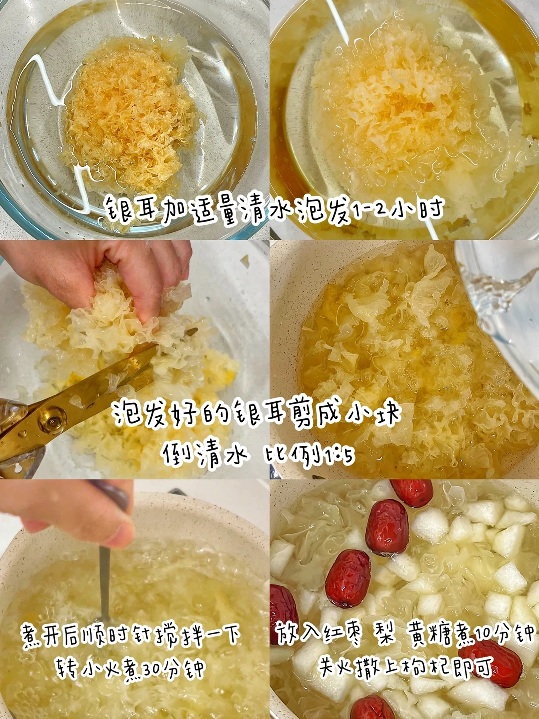 分享一款特别适合秋冬季节喝的汤水,红枣银耳雪梨汤。大人宝宝都适合哦. ✅准备食材:银耳、梨、红枣、黄糖、枸杞 🔹银耳提前泡发,用剪刀剪成小块。 🔹银耳和清水1:5的比例煮开,顺时针搅一下(好让银耳更好的出胶)转小火煮30分钟 🔹放入梨、红枣和黄糖继续煮10分钟,关火撒上枸杞即可。