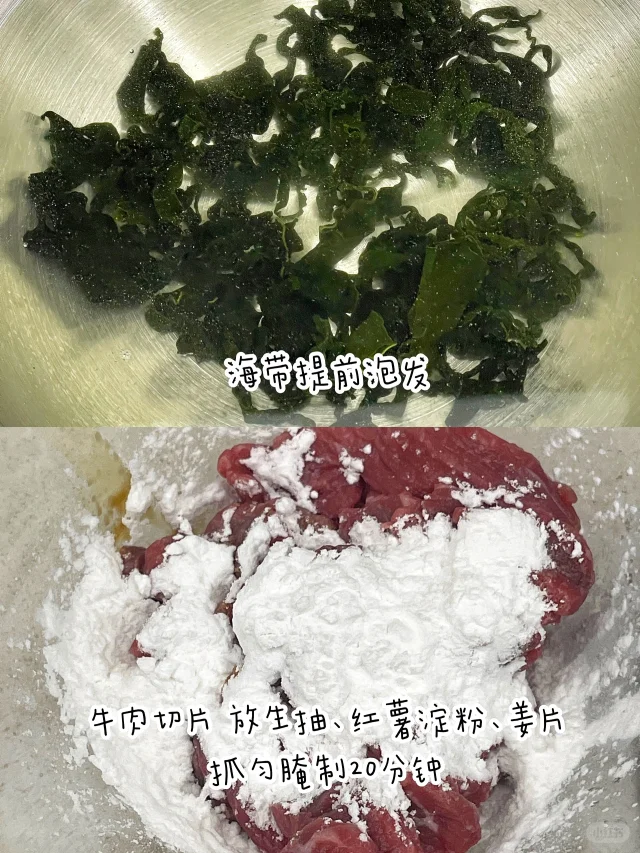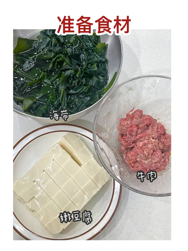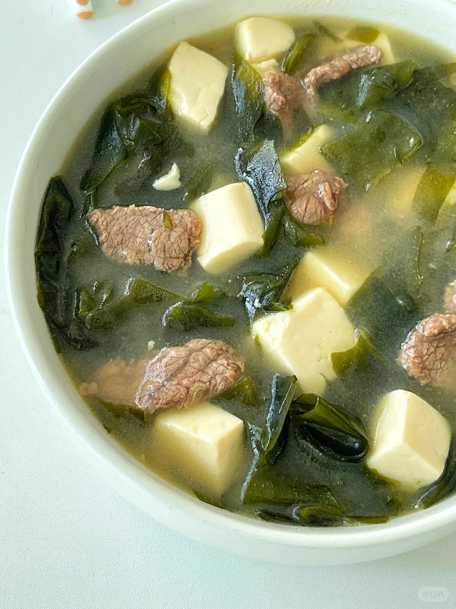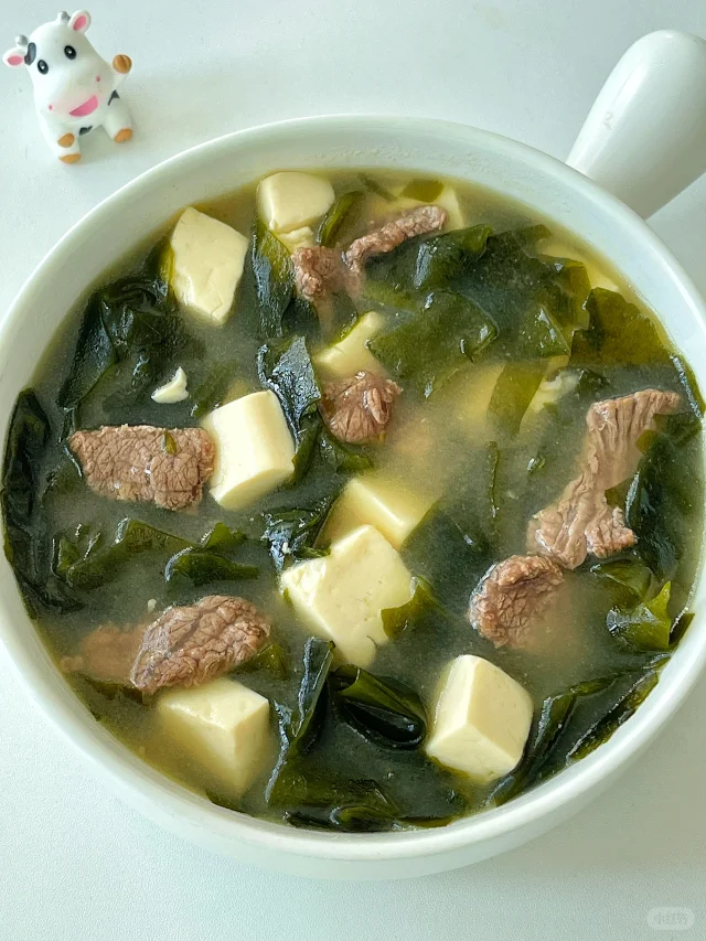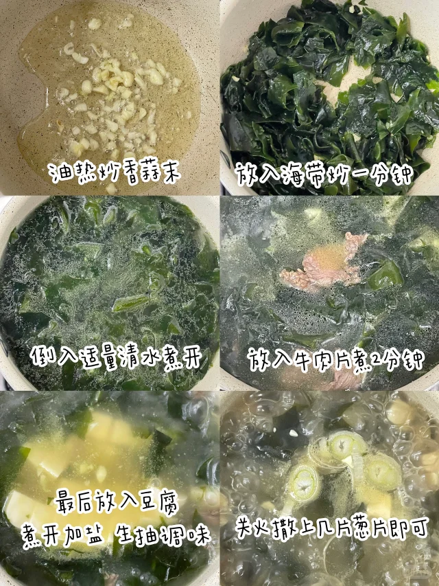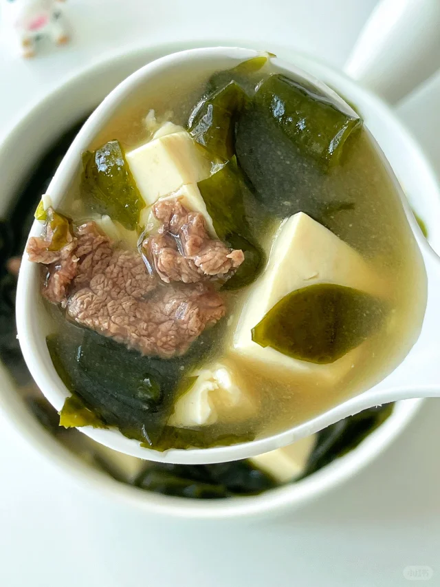答应我一定要给宝宝试试今天这道裙带菜牛肉豆腐汤,汤汁鲜美,牛肉滑嫩(不用担心宝宝嚼不烂),每次做我家宝宝都可以连喝两大碗,主食搭配米饭、面条、馒头都下饭。 ✅准备食材:裙带菜、牛肉、嫩豆腐。 ✅制作方法: 🔹裙带菜放入清水泡发。牛肉切片,放适量生抽、红薯粉、姜片抓匀腌制20分钟。 🔹油热放入蒜末炒出香味 🔹放入泡发好的裙带菜炒一分钟,倒入适量的清水煮开 🔹放入牛肉煮2分钟,放入嫩豆腐煮开,加盐和生抽调味🔹关火撒上几片葱花即可。