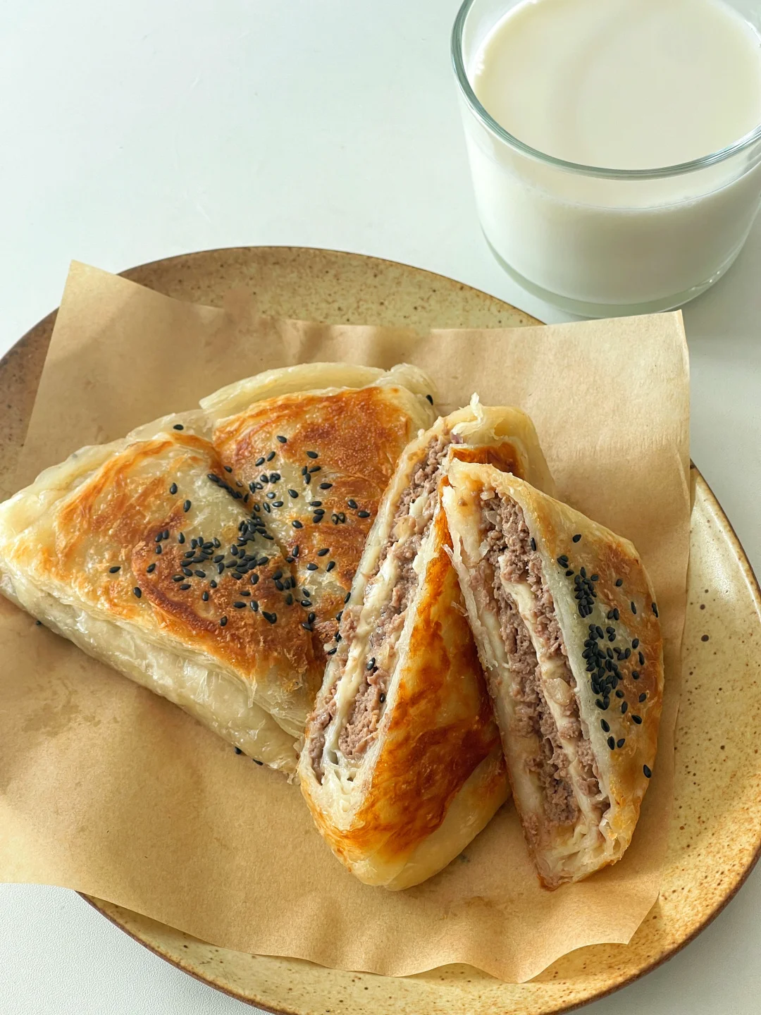分享一款好吃又快手的早餐做法——千层牛肉饼,外皮酥脆,肉馅儿鲜嫩,真的太好吃了。用的手抓饼,无需和面,早上轻松搞定~ ✅准备食材:牛肉馅儿、手抓饼、洋葱 ✅制作方法: 🔹牛肉放入料理机打成肉馅,放入切好的洋葱丁,加生抽、耗油、一勺白糖、鲜菇粉搅拌均匀,腌制15~20分钟(早上时间紧,可以提前一晚上腌制放冰箱保存,第二天用) 🔹手抓饼室温放置变软,中间一半部分切开,饼的3/4部分均匀的码上馅儿料,从切开的位置顺时针把饼折叠起来,捏好口。 🔹平底锅刷油,油热放入煎至各个面熟透即可。