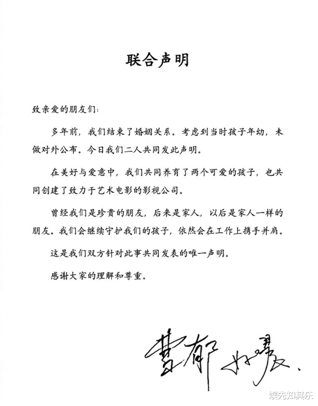 “我们早已解除了法律上的夫妻契约。只因彼时孩子尚且年幼,为了呵护他们的成长,我们选择将这一变动暂时隐于幕后,未向公众透露。回首过往,我们曾是彼此生命中弥足珍贵的挚友,后来是家人,以后是家人一样的朋友。我们将继续共同抚养子女,并在影视事业上保持合作。”