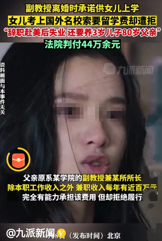 “父女一场非要这样吗?”北京,教授跟妻子离婚时承诺供女儿上大学,结果女儿考上外国名校后,他却借口要照顾3岁幼子和80岁老父亲,拒绝支付一年70多万元的学费,被女儿告上法庭,法院判了。 (案例来源:九派新闻)