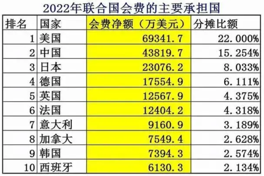 缴费基数中国位居第二,仅次于美国。联合国会费主要承担国有10个,按缴费比例排列,由高到低,分别为美、中、日、德、英、法、意、加、韩、西班牙。亚洲占三个份额。