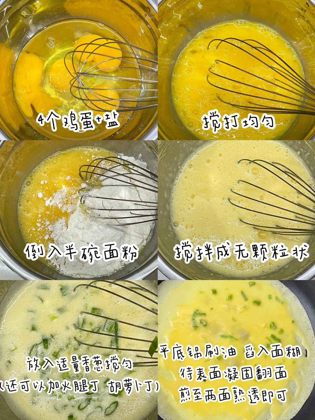 早上不知道给娃做啥的,可以考虑今天这道超级软乎又好吃的的香葱鸡蛋饼哦,再搭配粥或者牛奶,早餐轻松搞定~ ✅制作方法: 🔹4颗鸡蛋+一勺盐搅匀。 🔹加入半碗面粉、适量清水搅拌至无颗粒状(调好的面糊是略稀的,这样做出的饼是软软的) 🔹再加入葱花搅匀。 🔹锅中刷油,油热舀入一勺面糊,快速转动锅使面糊均匀转成圆形⭕️,定型后翻面,两面煎熟即可。