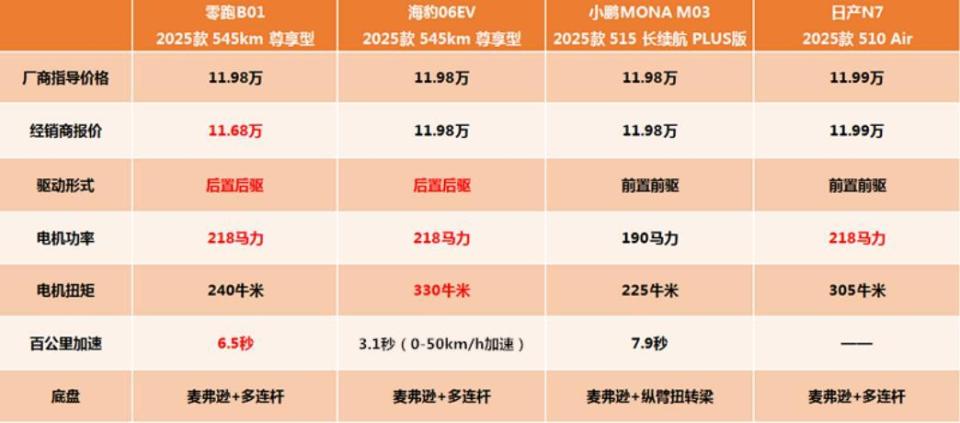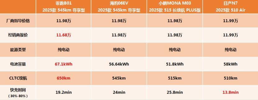 那么,这四款车谁的实力更强,谁更具品价比?为了公平起见,我们对比的这四款车型,价格基本保持一致,值得一提的是,小鹏MONA M03、海豹06 EV、日产N7都没有现金优惠,只是在礼品、充电桩、金融上有一定的优惠,而零跑B01则有3000元的现金优惠,而且还有至高5000元金融补贴以及本品赠换购补贴4000元等权益,优惠力度确实很大。