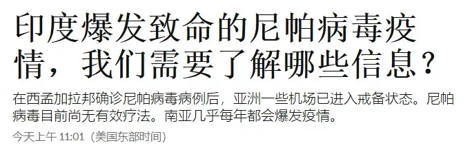 这几天,印度西孟加拉邦突然爆发了尼帕病毒,这病毒致死率高,能人传人,关键还没特效药!