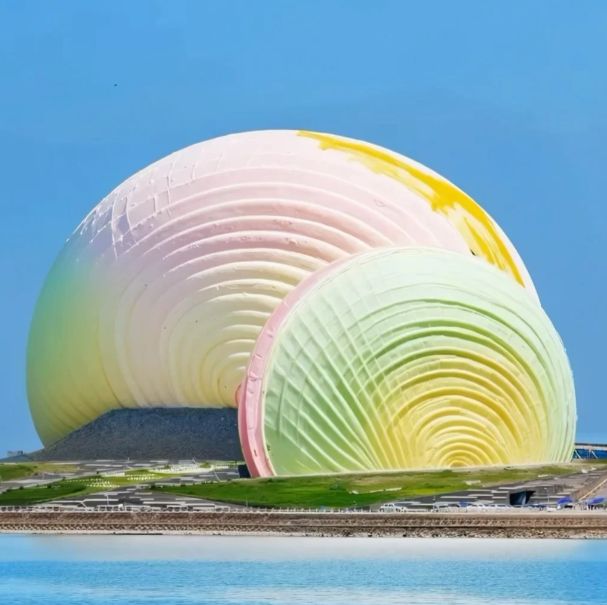 日月贝的建筑形态与周围环境融为一体。日贝(大贝壳)高约90米,月贝(小贝壳)高约60米,两者相互依偎,其线条在海天之间勾勒出简洁而优雅的轮廓。建筑外壳采用穿孔铝板拼接而成,阳光穿过这些孔洞,会在地面投射出斑驳的光影;走近触摸,能感受到金属表面仿生的细腻纹理。
