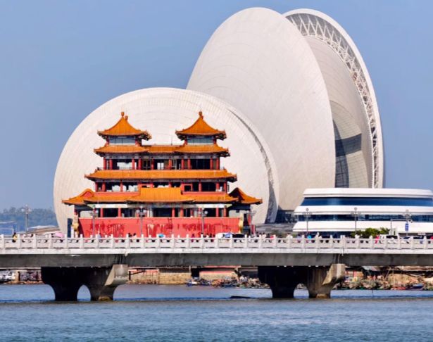 在珠江口西岸,珠海市香洲区的情侣路旁,有一座独特的建筑——珠海大剧院,因其造型而被人们亲切地称为“日月贝”。它由一大一小两组“贝壳”组成,坐落在野狸岛上,是中国唯一一座建设在海岛上的大剧院。这座建筑以珠江口特有的“日月贝”为灵感,其设计构思源自海洋,寓意“珠生于贝,贝生于海”,成为了诠释珠海城市风貌的现代地标。