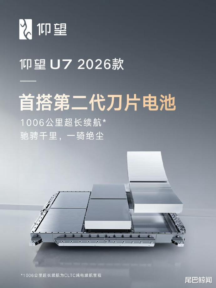 仰望汽车正式官宣,2026款仰望U7将首发搭载比亚迪第二代刀片电池,实现1006公里CLTC超长续航。