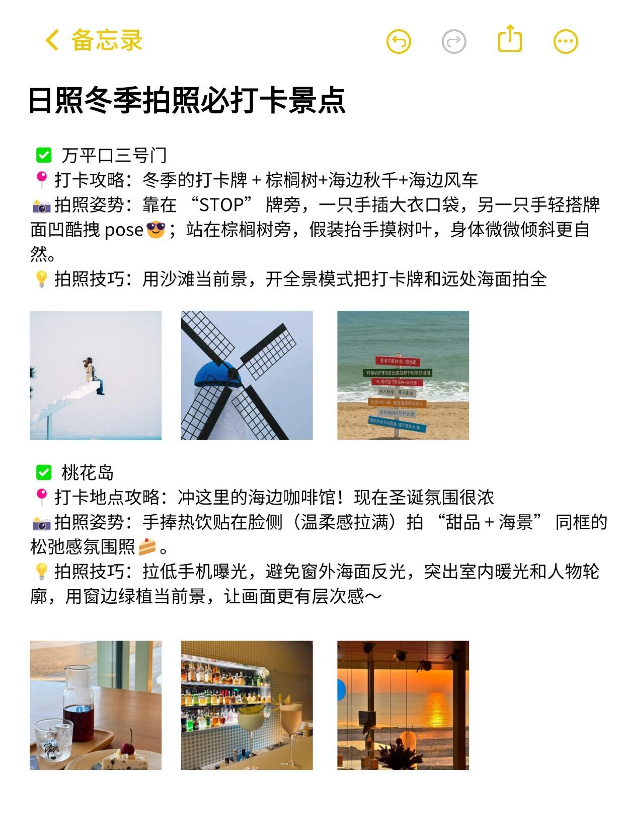 💡拍照技巧:以沙滩为前景,开全景模式拍全打卡牌 + 远处海面☕桃花岛