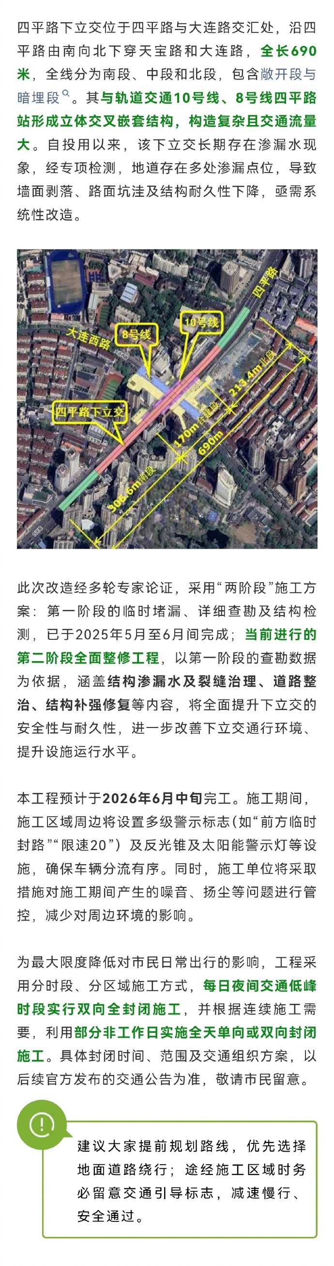 四平路下立交维修改造工程于12月23日晚正式启动施工,预计于2026年6月中旬完工。工程将通过系统性维修升级,全面提升下