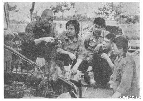 广阔天地大有作为人民公社,积极从知识青年中培养农业技术员和农机手。这是老贫农在给青年们讲拖拉机的性能。