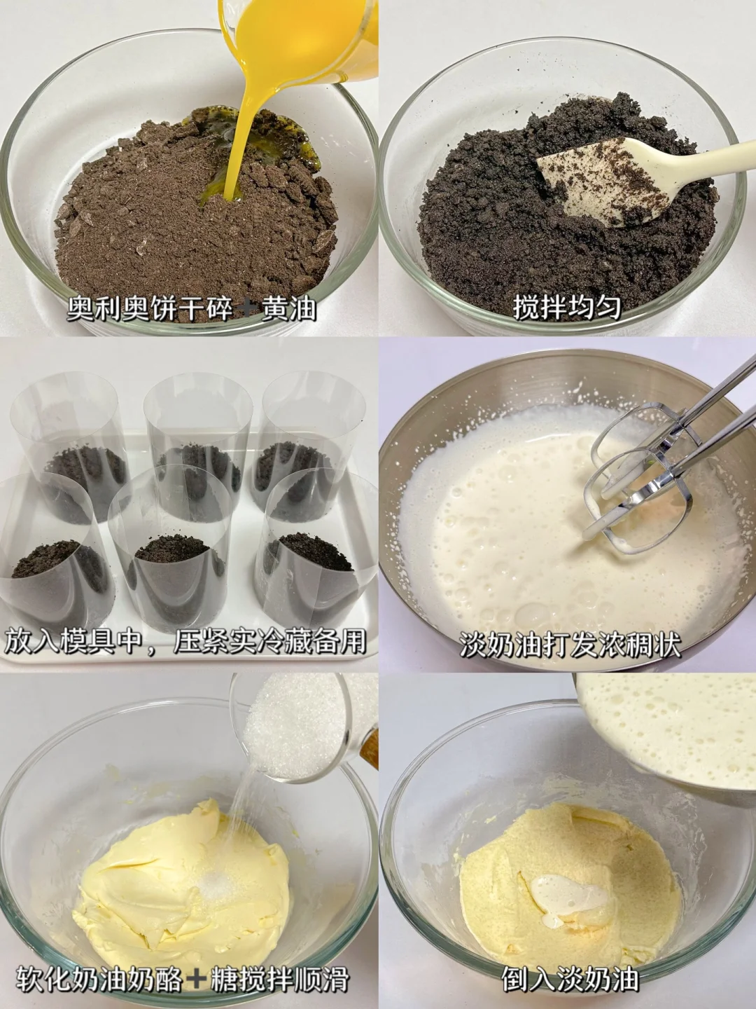 1⃣️奥利奥饼干碎加黄油搅拌均匀,放入模具中,压紧实冷藏备用。