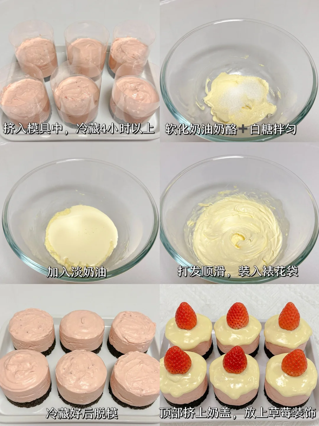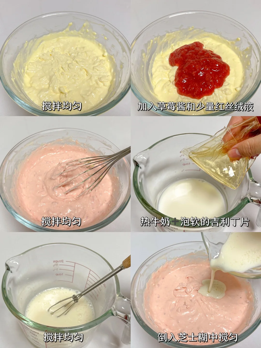 2⃣️淡奶油打发浓稠状,软化奶油奶酪加白糖搅拌顺滑,倒入淡奶油搅拌均匀,加入草莓酱和少量红丝绒液搅拌均匀,热牛奶加泡软的吉利丁片搅拌均匀后倒入芝士糊中,装入裱花袋,挤入模具中,冰箱冷藏4小时以上。